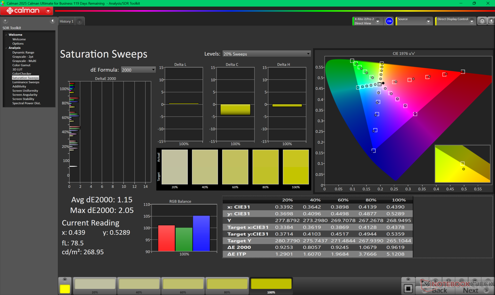 Maksimum parlaklık SDR modunda ~550 nit veya HDR modu etkinleştirildiğinde 1066 nit'e ulaşıyor. bu nedenle 4K HDR oynatma, çoğu meraklı düzey tüketici dizüstü bilgisayarından daha iyi veya daha iyidir.