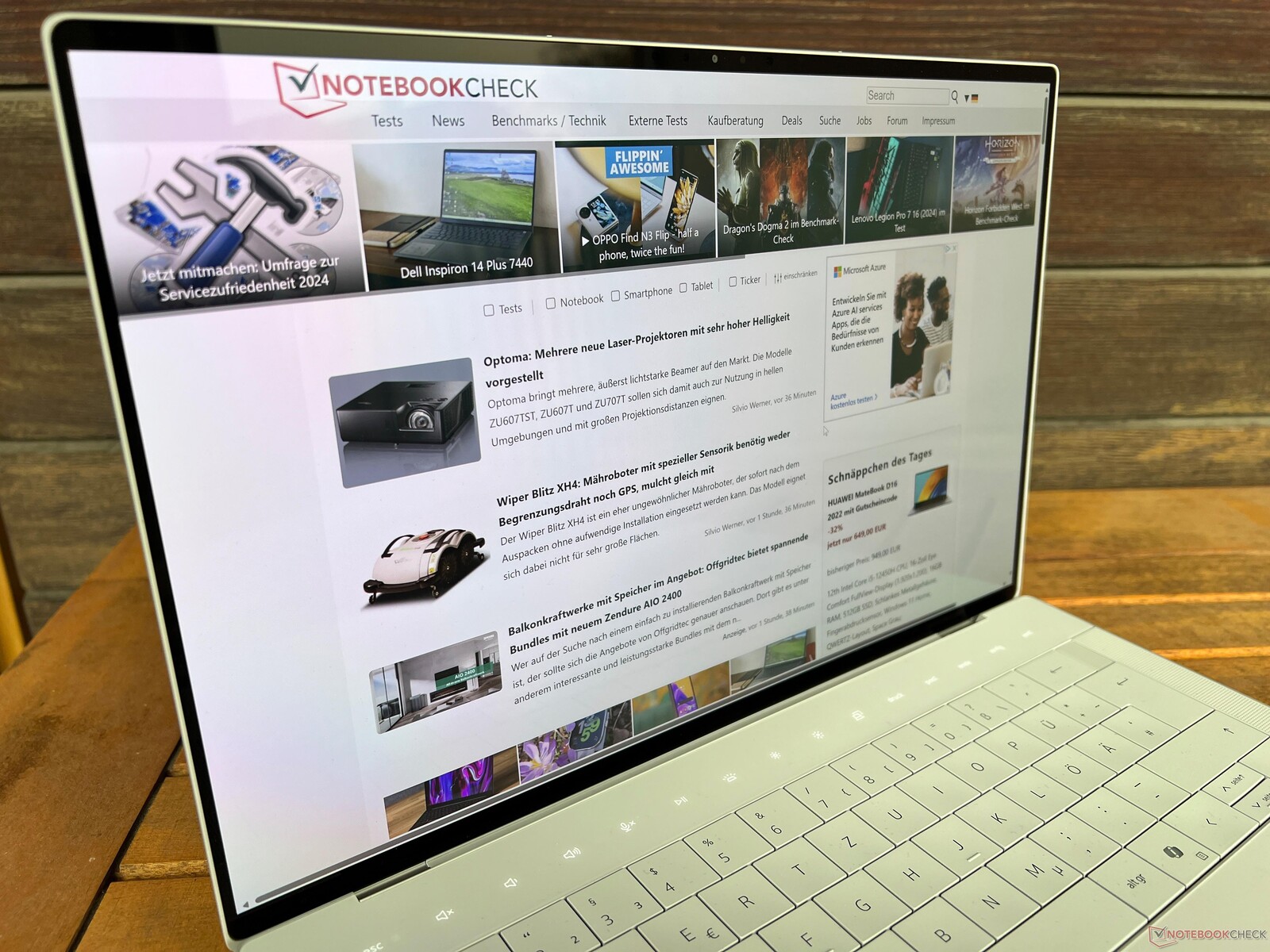 Yeni XPS 14 9440 standart olarak 14,5 inç Full HD panelle (dokunmatik ekran yok) donatılmıştır; 300 ABD doları ek ücret karşılığında bunun yerine 3.200 x 2.000 piksel çözünürlüğe sahip yüksek çözünürlüklü OLED dokunmatik ekranı seçebilirsiniz. Öznel olarak, yansıtıcı panelin görüntü kalitesi genel olarak çok iyi, içerik son derece keskin bir şekilde gösteriliyor ve renkler canlı görünüyor; ancak özellikle hafif içerikleri görüntülerken hafif bir raster etkisi fark ediyorsunuz. Samsung'un mevcut OLED neslinde (örneğin Galaxy Book4 Pro 14, inceleme yakında) aynı sorunu fark etmedik ve Dell'in OLED'i parlaklık açısından da biraz geride kalıyor.