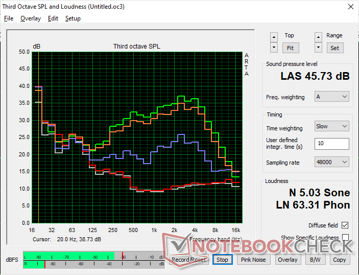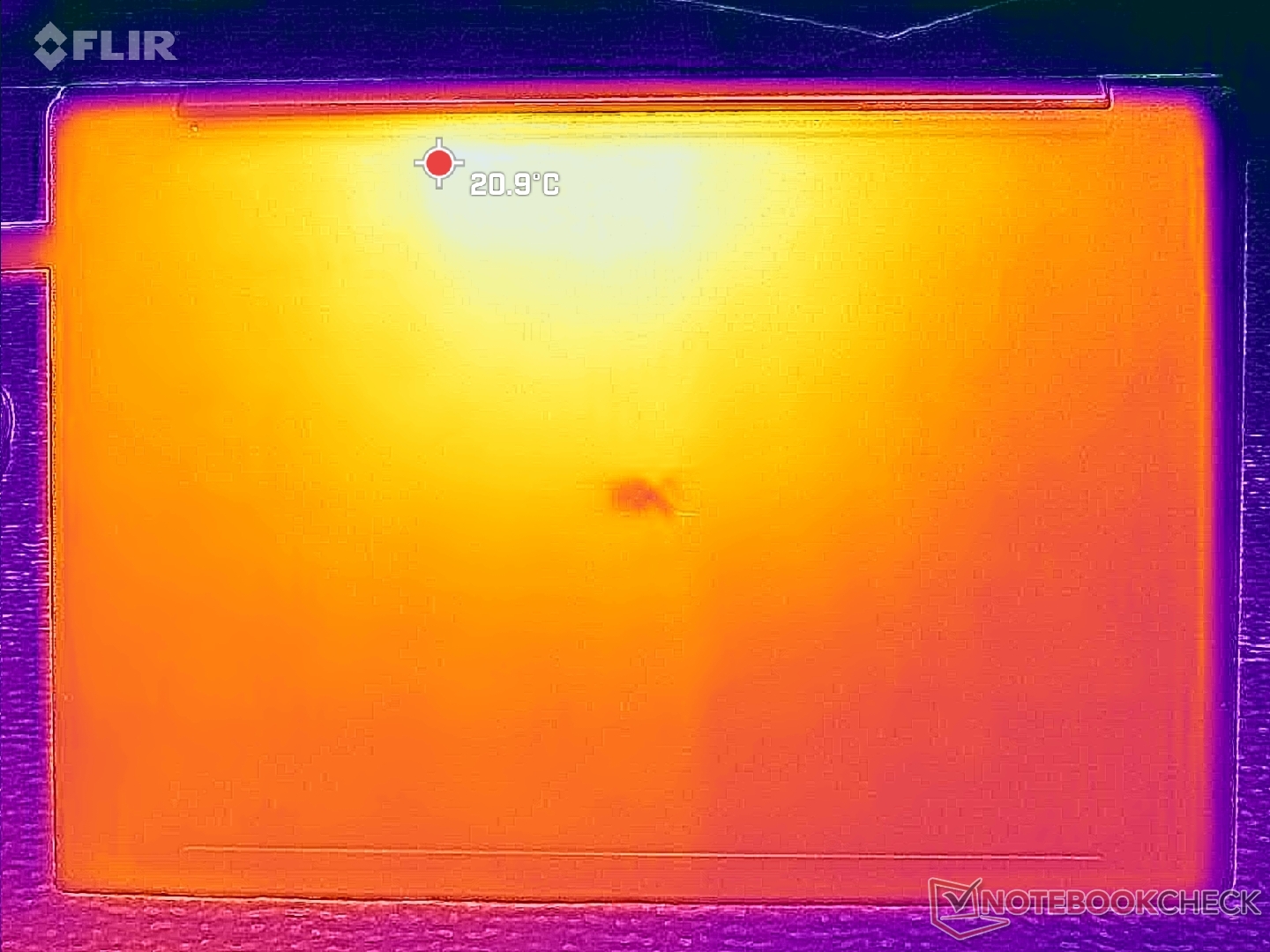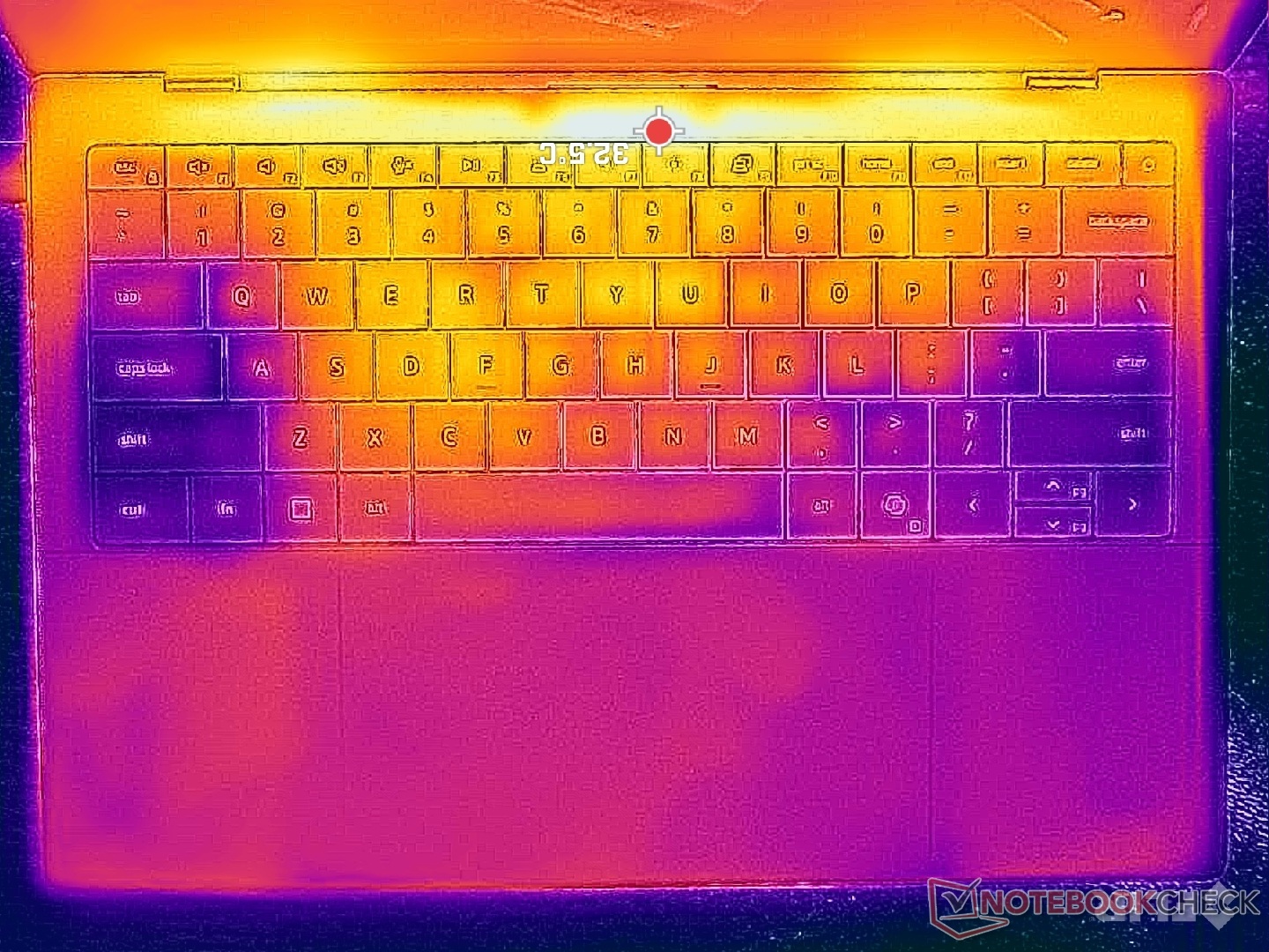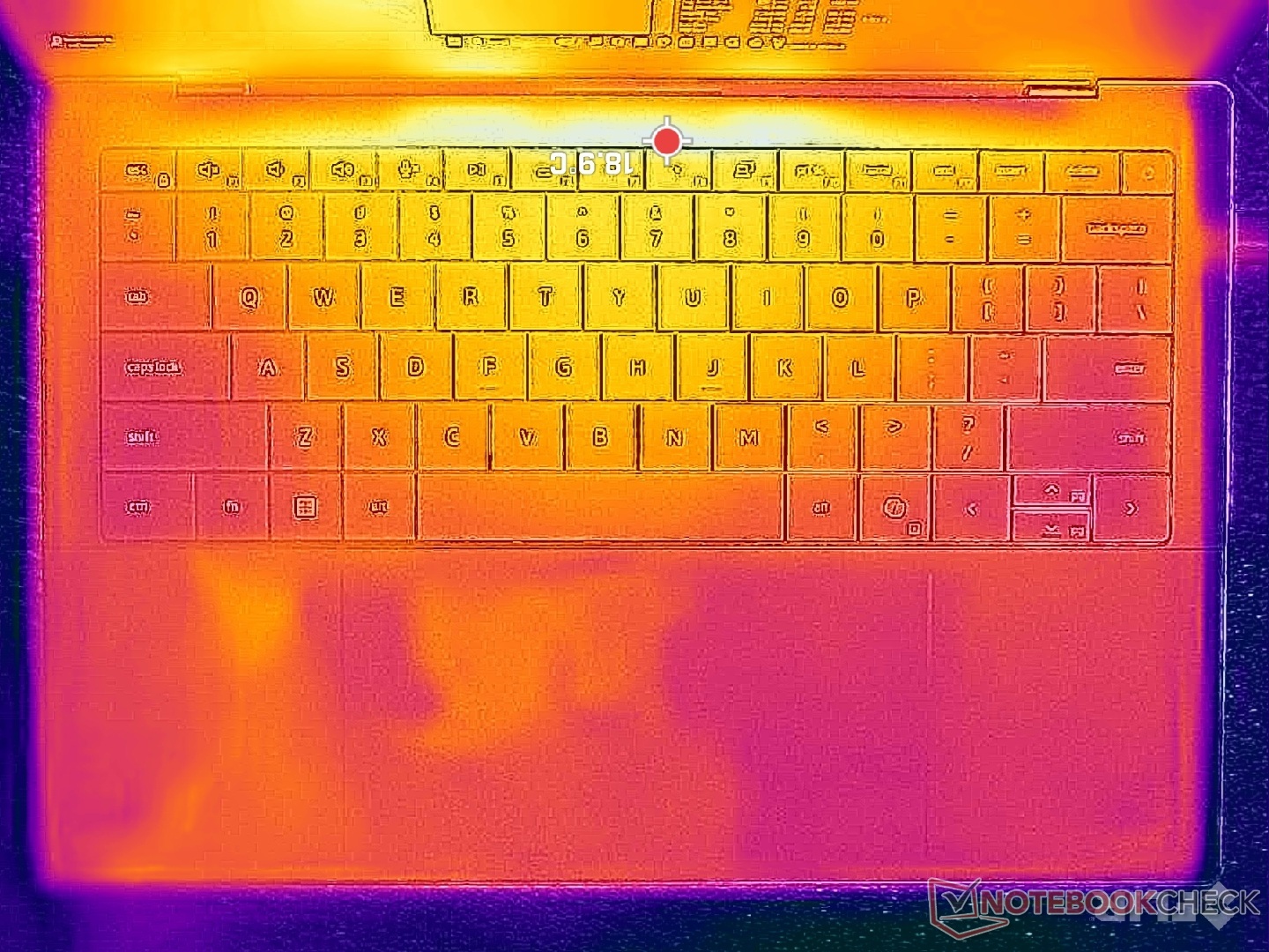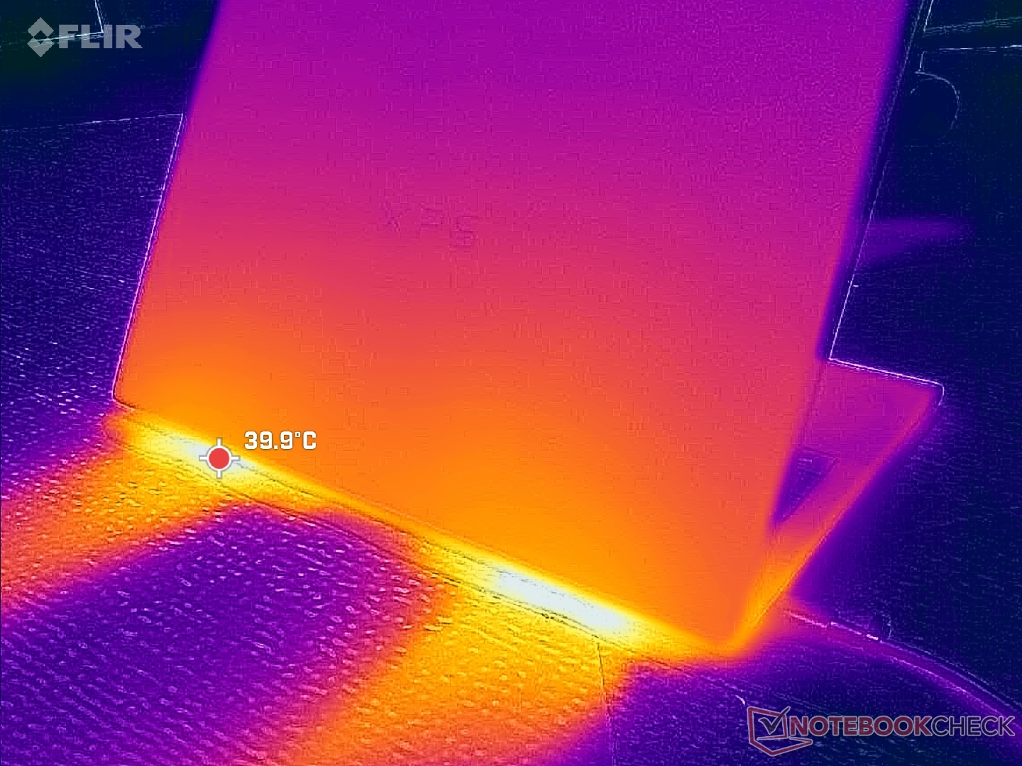 Yüzey sıcaklıkları, daha zorlu yükleri çalıştırırken özellikle alt kısımda (D kapağı) 2025 Dell 14 Premium'da kaydettiğimizden biraz daha yüksek. Sıcak nokta, geçen yılın tasarımındaki 34 C'ye kıyasla 36 C ila 39 C'ye ulaşabilir. Bunun dışında farklılıklar minimum düzeyde ve kullanım sırasında dikkat dağıtacak kadar sıcak değil.