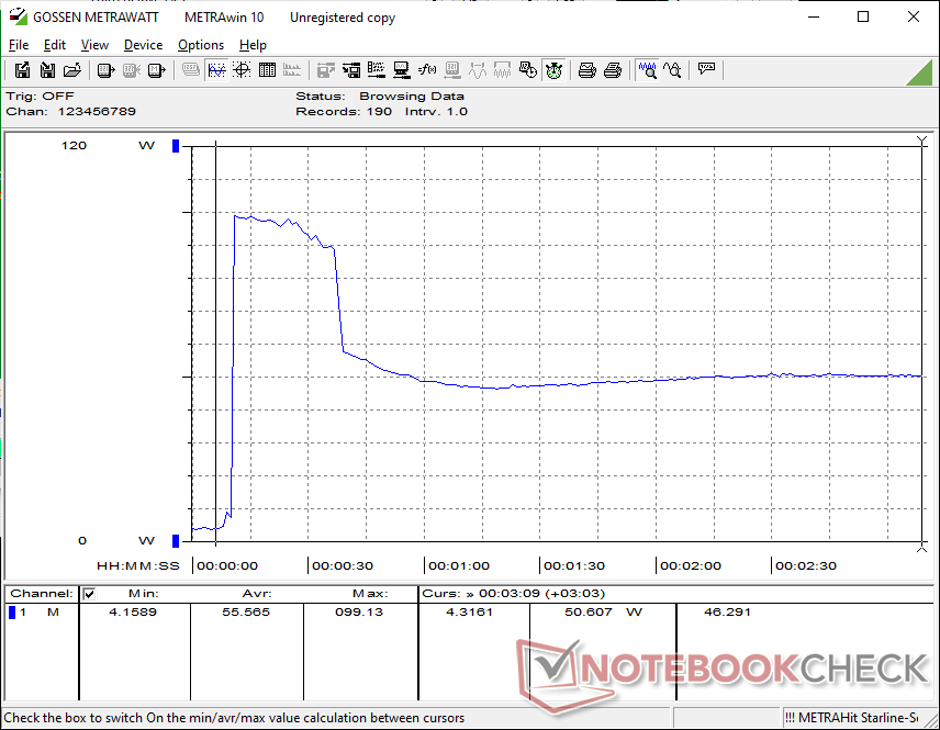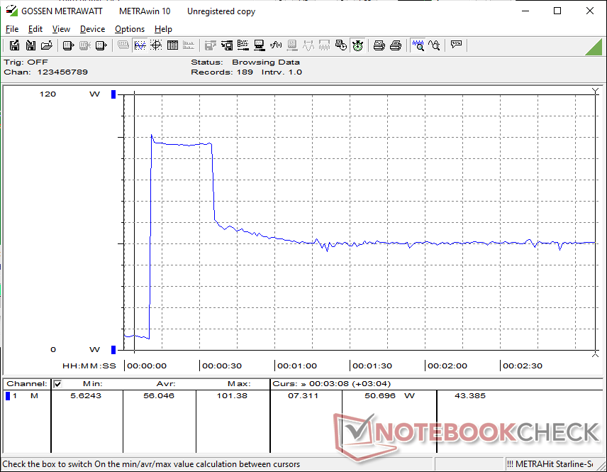CPU tamamen zorlandığında küçük (~10,2 x 5,5 x 2,2 cm) 100 W USB-C AC adaptöründen 102 W'lık geçici bir maksimum çekiş kaydedebiliyoruz ki bu, benzer koşullar altında 2025 XPS 14'ten çok daha yüksek. Daha yüksek güç tavanı, Panther Lake-H'nin Arrow Lake-H'ye kıyasla daha yüksek Turbo Boost tavanını örneklemektedir.