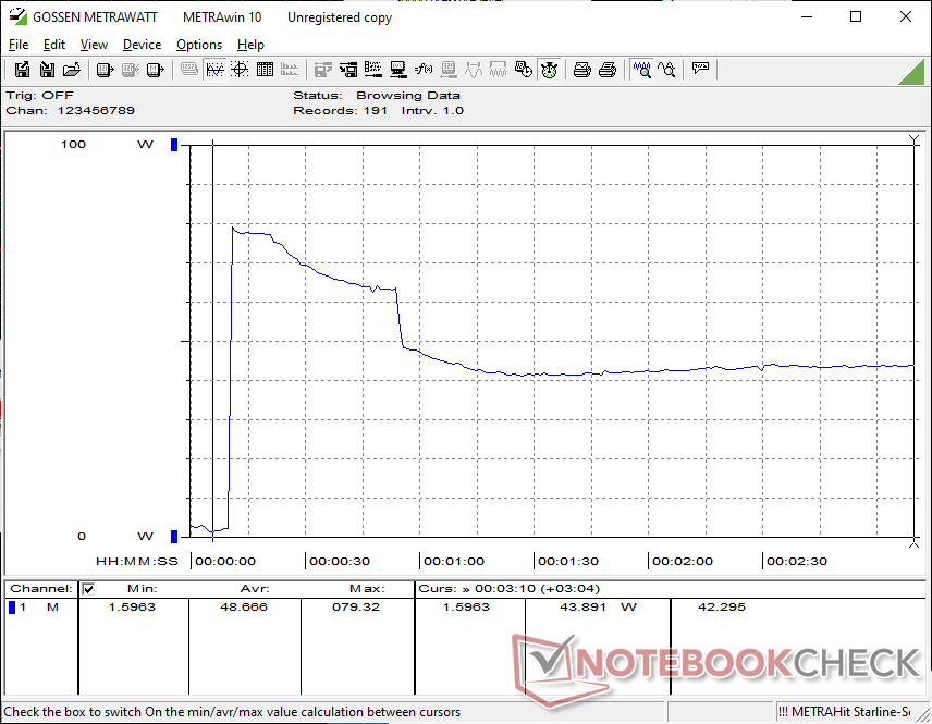 100 W evrensel USB-C AC adaptörü tüm 2026 XPS 14 konfigürasyonlarında aynıdır. Ancak Core Ultra 7'de Turbo Boost potansiyeli daha düşük olduğundan, Core Ultra X7 yapılandırmasındaki 101 W'a kıyasla CPU tamamen zorlandığında yalnızca 80 W maksimum çekişe ulaşabiliyoruz.