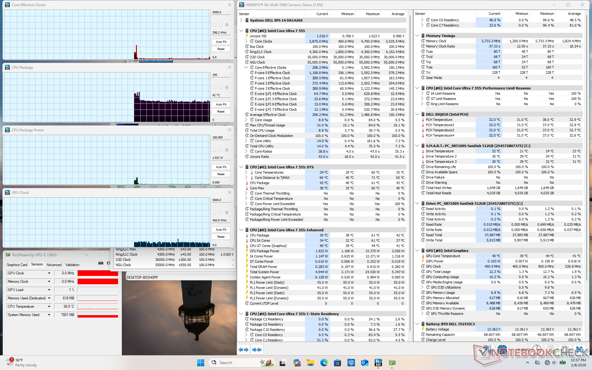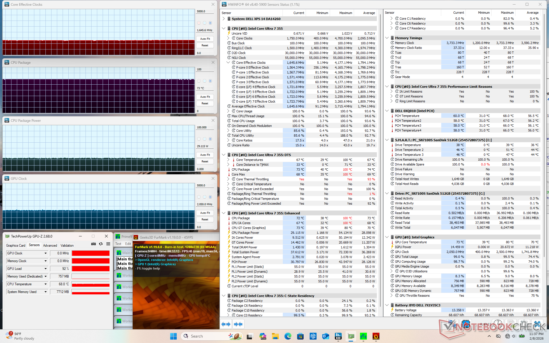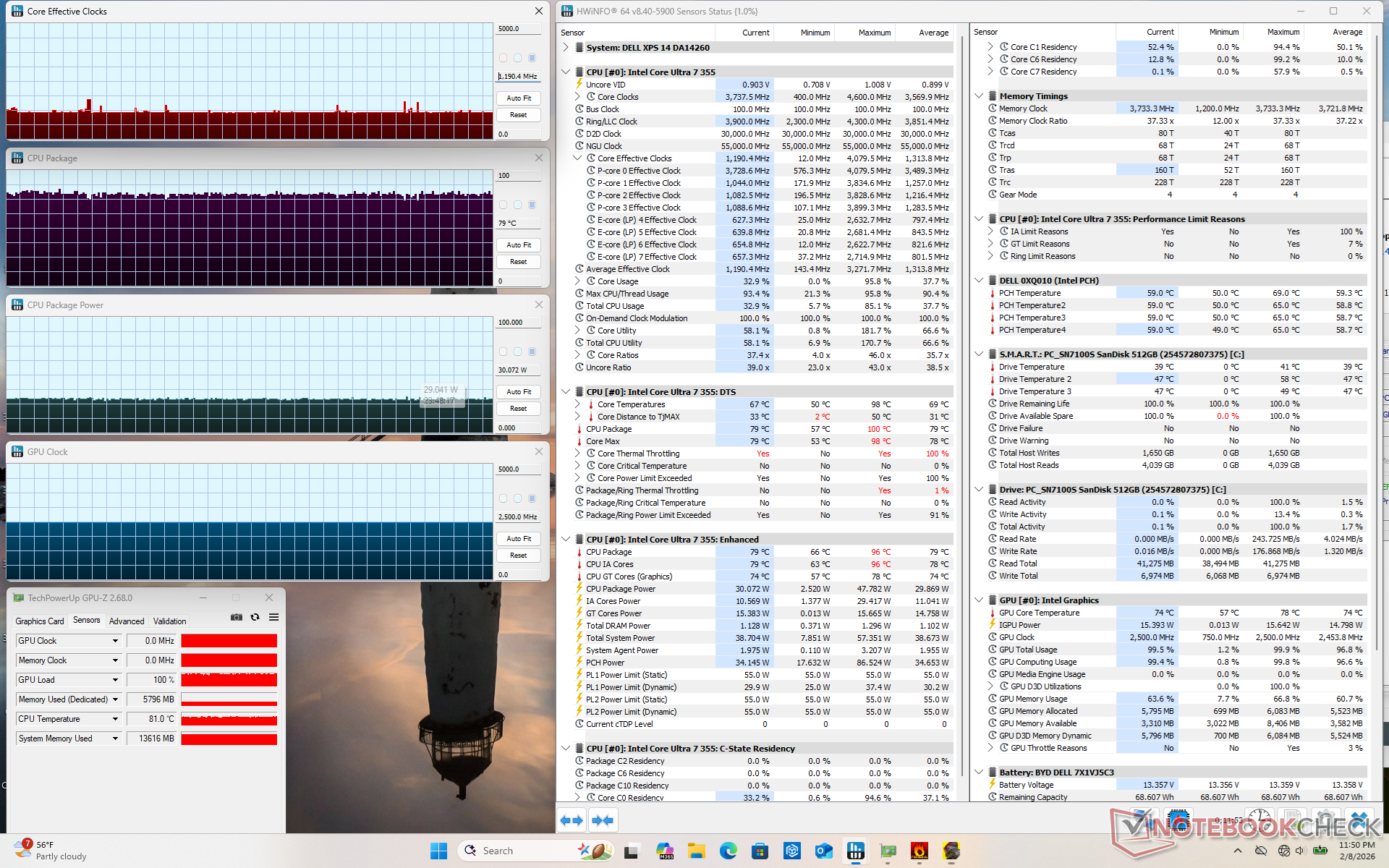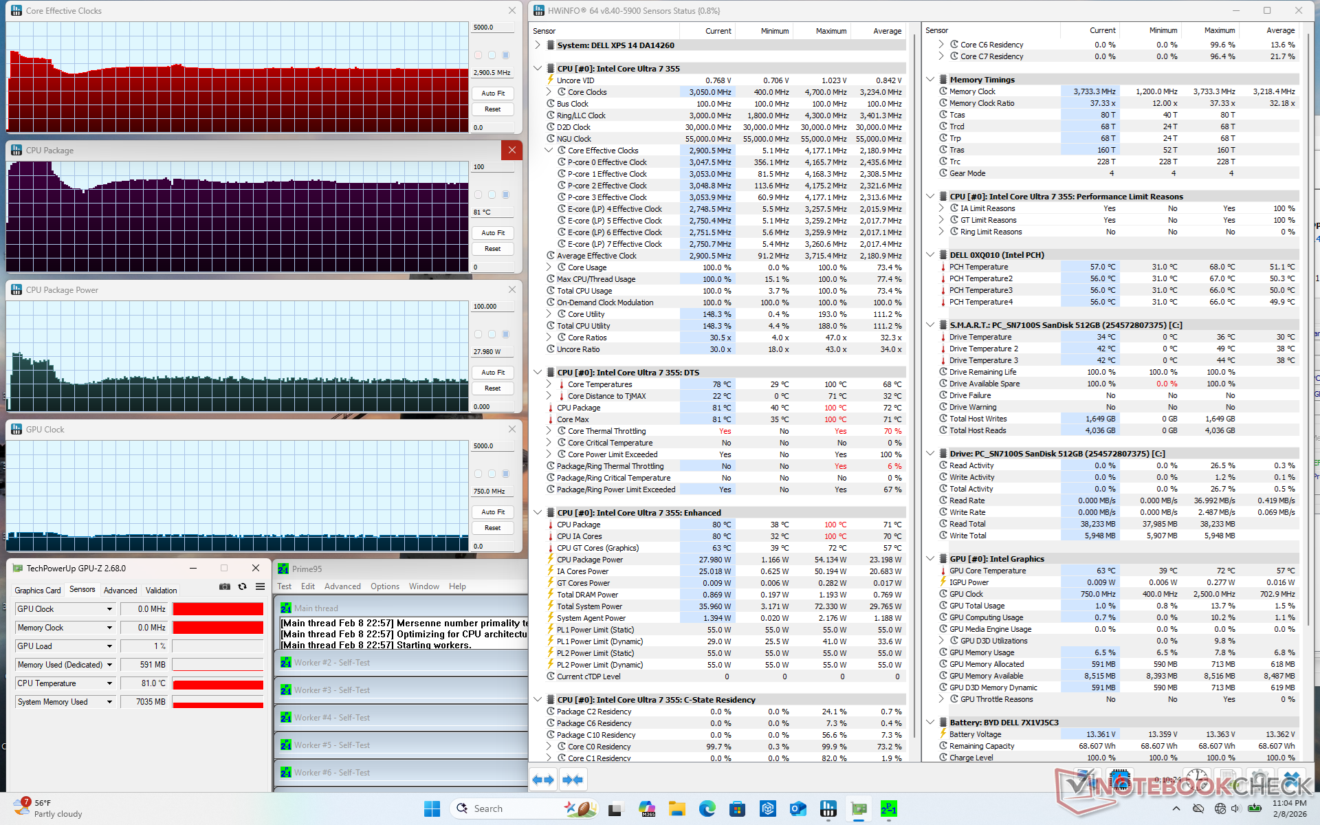 Prime95 stresini çalıştırırken, CPU 3,7 GHz ve 54 W'a yükselir ve 100 C'de sadece birkaç saniye sürer. Daha sonra, sınırlı Turbo Boost potansiyelini temsil etmek için 2,9 GHz, 28 W ve 81 C'de stabilize olur. Zorlu yükleri çalıştırırken çekirdek sıcaklığı 80 C'nin altında plato çiziyor ki bu da geçen yılki Arrow Lake-H'de kaydettiğimizden biraz daha soğuk Dell 14 Premium.
