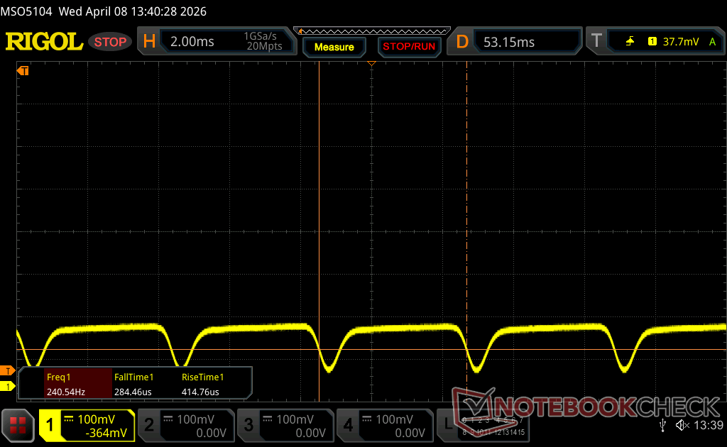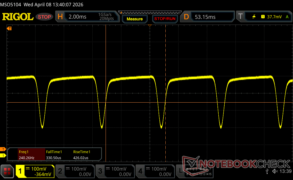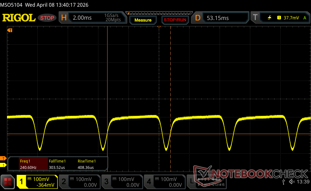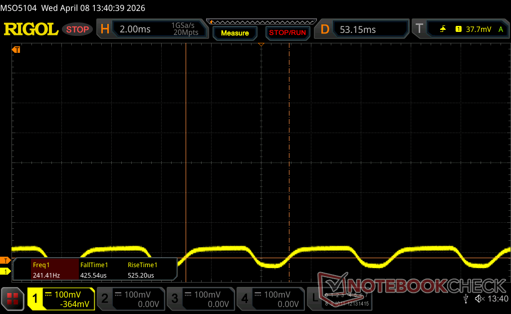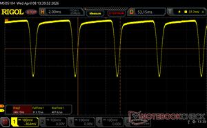 Ekran arka ışığı 240.2 Hz'de titriyor (en kötü durum, örneğin PWM kullanılması) 100 % ve altındaki parlaklık ayarında titreme algılandı. Bu parlaklık ayarının üzerinde titreme veya PWM olmamalıdır. 240.2 Hz frekansı nispeten düşüktür, bu nedenle hassas kullanıcılar belirtilen parlaklık ayarında ve altında muhtemelen titremeyi fark edecek ve göz yorgunluğu yaşayacaktır. Karşılaştırıldığında: Test edilen tüm cihazların %52 %'si ekranı karartmak için PWM kullanmıyor. PWM tespit edilirse, ortalama 7914 (minimum: 5 - maksimum: 343500) Hz ölçüldü. | |||
