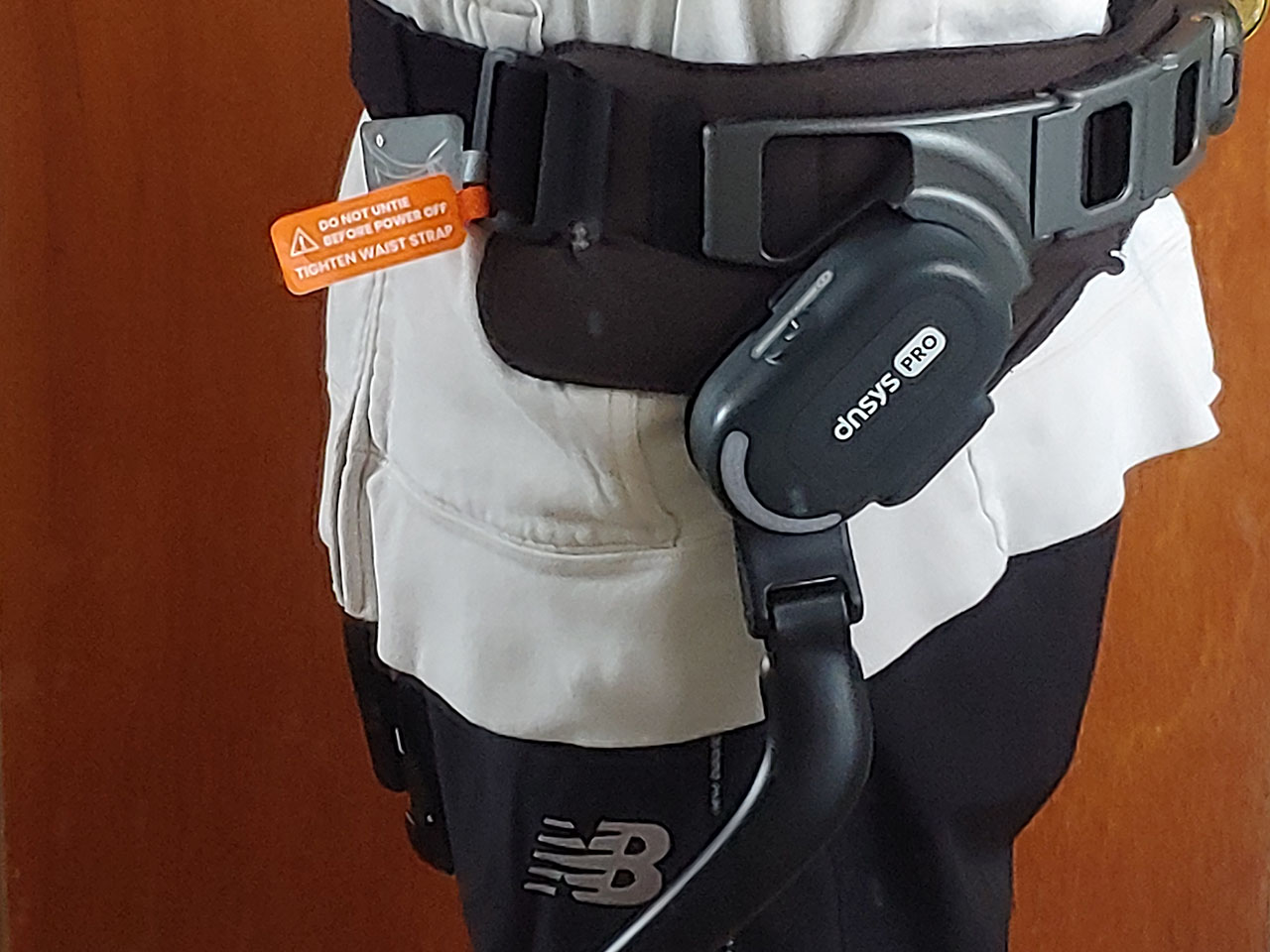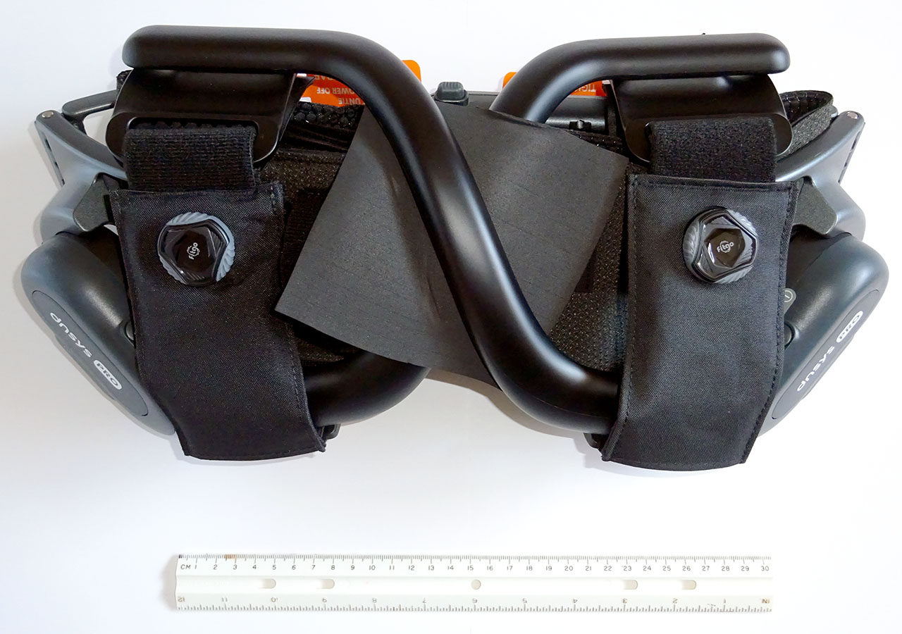 Motorları kalçaların iliak tepelerine yerleştirmek için ayarlanması gereken kemeri takmak için iki el gereklidir. Kemerin arkasındaki açıkta kalan Velcro tahrişe neden olabilir, bu nedenle gömlek giymek en iyisidir. Daha sonra bacak kayışlarının gerginliği dengelenmelidir çünkü kötü uyum dengesiz güç aktarımı yaratır.