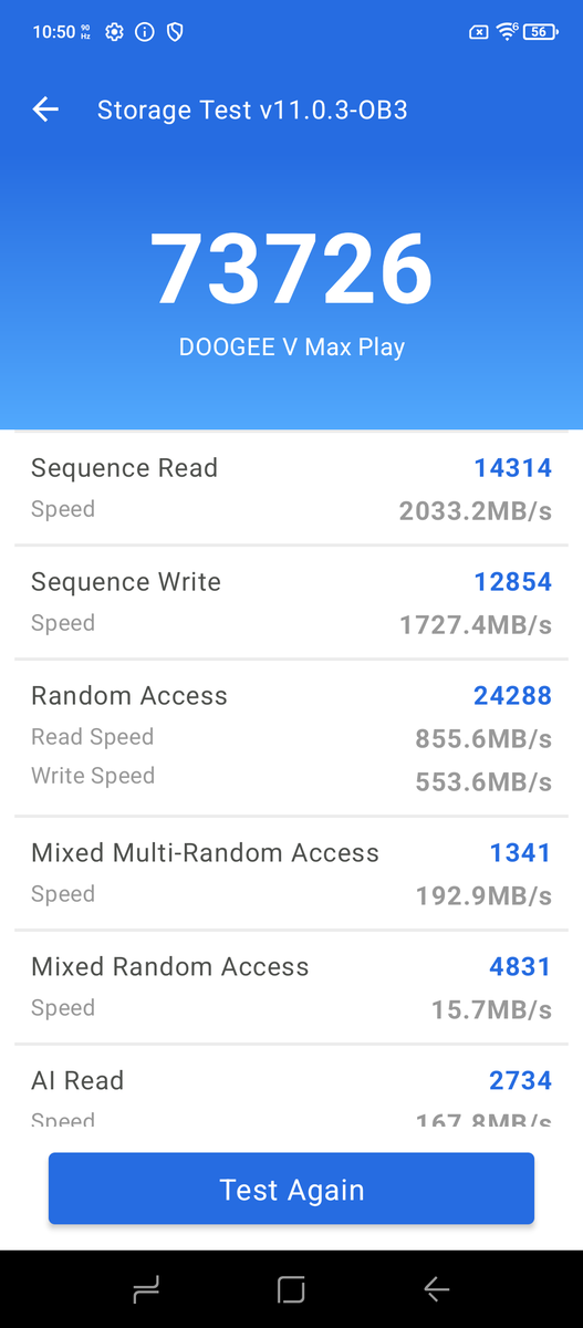 512 GB depolama yongası, ~2 GB/s sıralı okuma ile etkileyici derecede hızlıdır. 16 GB RAM ve kullanılan SoC de çoğu görev için yeterli; AnTuTu, test edilen V Max Play'in Mediatek'in Dimensity 7300X'den çok da farklı değildir Dimensity 7300. Her ikisi de orta saat hızlarına sahip 4 "büyük" ve 4 "küçük" çekirdeğe sahiptir.