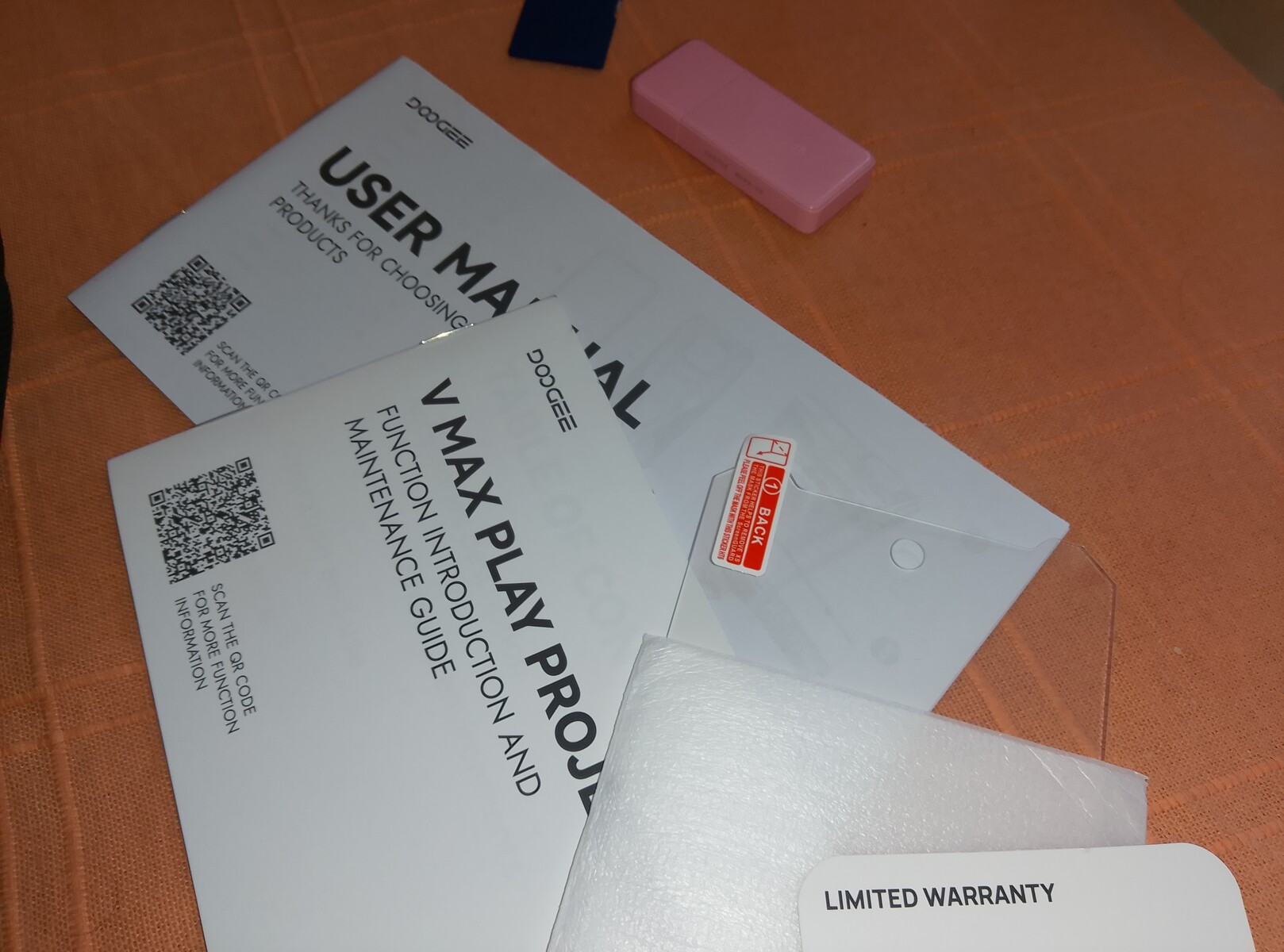 Normal bir karton kutuya ek olarak, telefonun kullanıcıya giderken güvenliğini sağlayan siyah plastik bir seyahat çantası. Çantada V Max Play'in yanı sıra 45 W'lık küçük bir şarj cihazı, USB-C - USB-C kablosu, sert bir ekran koruyucu, çeşitli bilgi ve garanti kitapçıkları ve Doogee telefonun arkasını, altını, solunu ve sağını koruyan ve yanlarından birinde tutma yeri bulunan büyük bir plastik parça olan sert bir koruyucu kılıf ve telefon tutucu bulunuyor. Bu temel ürün seti; biraz daha fazla ödemeye hazır olanlar ayrıca Doogee markalı küçük bir Bluetooth hoparlör ve V Max Play'i projektör olarak kullanmayı biraz daha kolaylaştırması umulan bir standa sahip olacak.