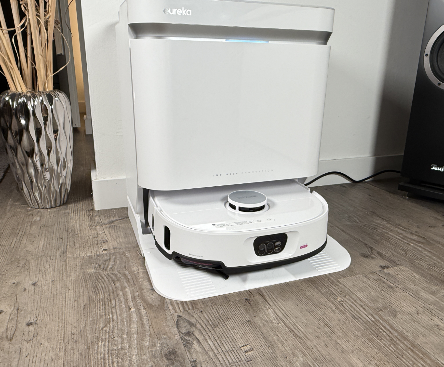 Burada üç parmaklı bir pençeye benzeyen uzatılabilir yan fırça ve gövdenin yanından dışarı uzanan paspas sayesinde Eureka, köşelere ve kenarlara doğru temizlik vaat ediyor. Engel tespiti için de kullanılan ve robot üzerinde geri çekilemeyen bir lazer kulesi ve ön tarafta bir kamera modülünden oluşan IntelliView AI 2.0 ile geziniyor. Ekipman ayrıca çift ayırma teknolojisine ve 45 mm'ye kadar eşik geçişine sahiptir.