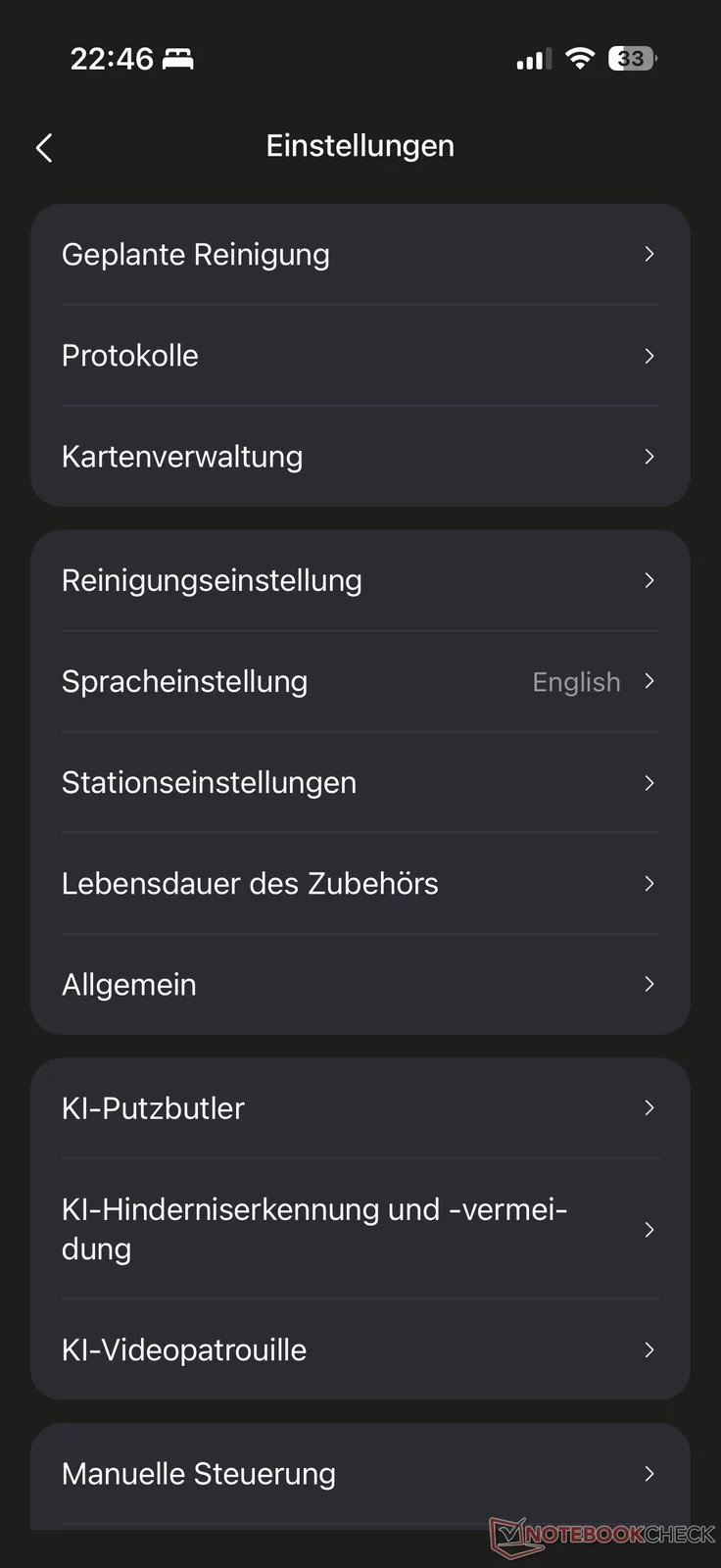 Sağ üstteki menüde çok sayıda ayar seçeneği görünür. Temizlik zamanlaması ve protokollerine ek olarak, temizlik için olağan ve önemli özelleştirme seçenekleri (her bir halı için ayrı ayarlar dahil), AI engel algılama, istasyon ve daha fazlası vardır. Canlı video aktarımına erişimin bir güvenlik kodu da dahil olmak üzere önceden etkinleştirme olmadan çalışması bizi rahatsız etti. Sesli kontrolü de özledik. Sadece Almanca sesli geri bildirim var.