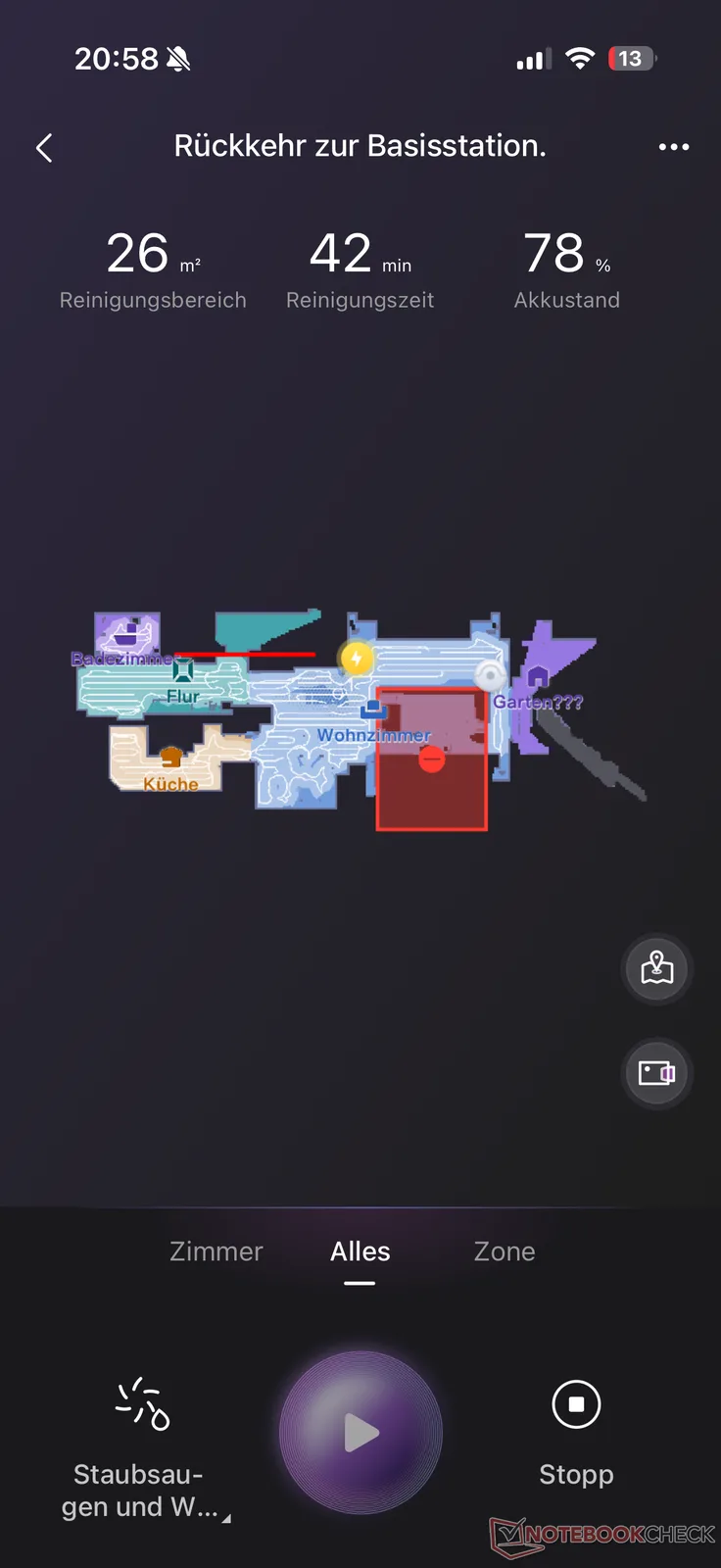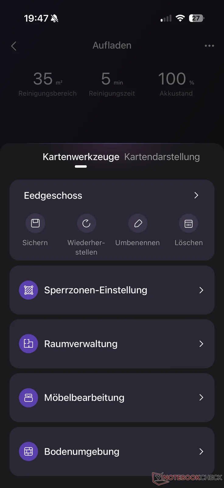 Bunu, tüm robot süpürgeler için olağan haritalama çalışması izliyor. Burada J15 Max Ultra, birkaç dakika içinde "yeni bölgesinin" sanal bir haritasını oluşturuyor. Otomatik oda bölme özellikle doğru çalışmadı. Diğer şeylerin yanı sıra, bir panjur tarafından kapatılan bir pencerenin, yansımaya dayanarak arkasında başka bir oda olduğu varsayıldı. Bununla birlikte, yanlışlıkların çoğu, kısıtlı bölgeler, eşikler, döşeme ve mobilyalar da dahil olmak üzere harita yönetimi aracılığıyla gerçek koşullara göre ayarlanabilir. Bununla birlikte, genel olarak, uygulamanın bazen oldukça uzun yükleme süreleri sayesinde, bir veya diğer üreticiyle harita özelleştirmesini daha çok sevdik.