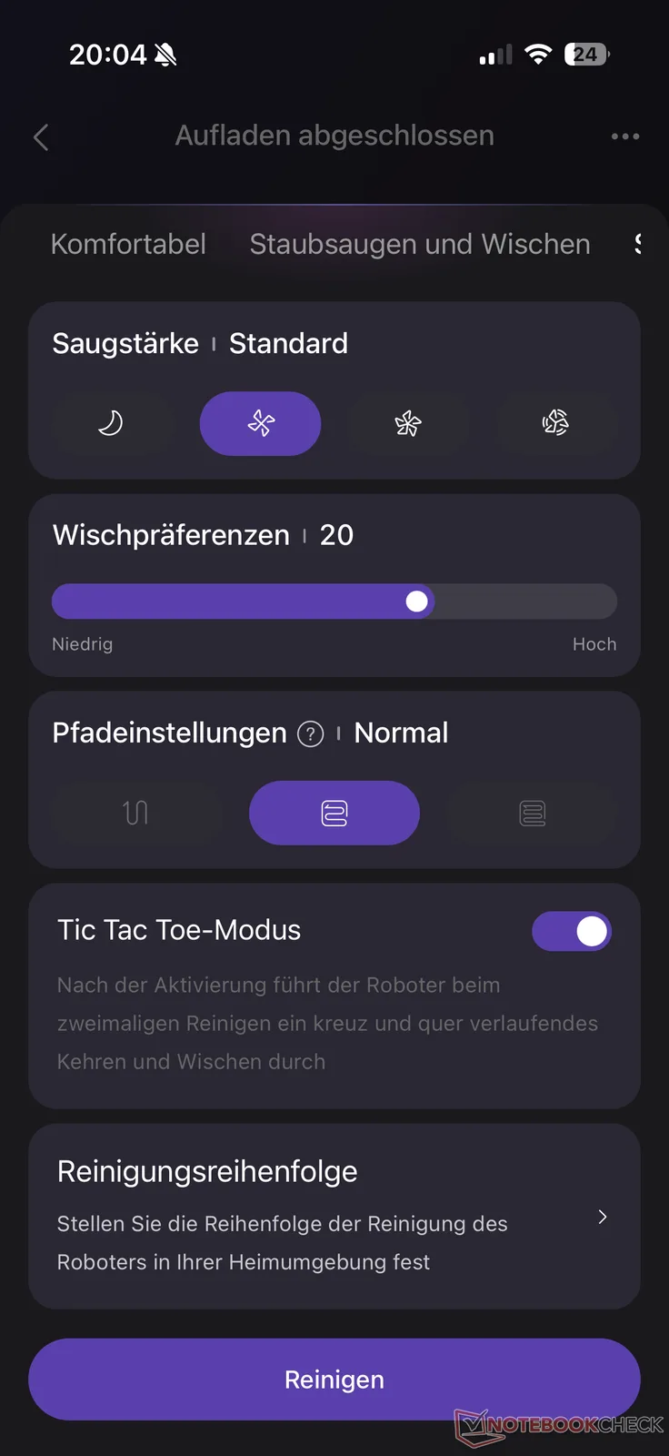Ancak Eureka, mevcut temizlik ayarları söz konusu olduğunda pazar liderlerinden hiçbir şekilde aşağı kalmaz. Tam temizlik, odalar ve bölgeler için dört standart "Vakumla ve paspasla", "Vakumla ve sonra paspasla", "Paspasla" ve "Vakumla" modlarına ek olarak, her oda için ayrı ayar seçeneği ve otomatik ayarlı bir AI modu da vardır. Temizleme gücü dört güçte (Sessiz, Standart, Turbo, Maksimum), paspaslama nemi 30 seviyede ve yol ayarı üç seçenekte (Kaba, Normal, İnce) ayarlanabilir. Temizleme sırası da ayarlanabilir. Üst fiyat aralığındaki modeller için hepsi standarttır, ancak önemlidir.