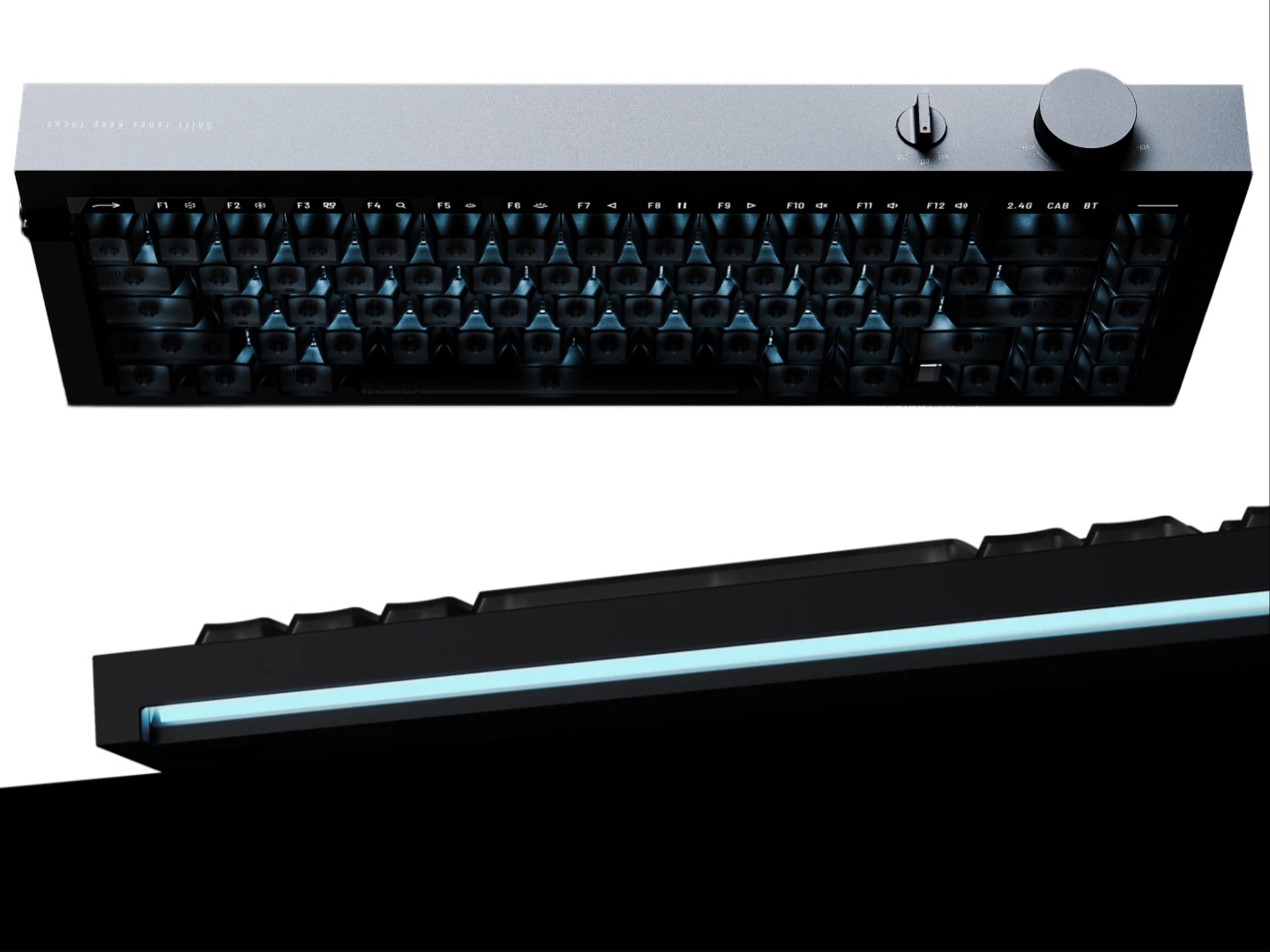 Tasarıma gelince, kasa tek bir alüminyum bloktan CNC ile öğütülmüştür. 65'lik bir klavyedir, ancak özel bir geçiş ve LED göstergeler aracılığıyla işlev satırını akıllıca entegre eder. Ses kontrolü için bir düğme ve güç, kablolu ve kablosuz modlar için üç yönlü bir geçiş anahtarı vardır. Alt kısımda ayak olmasa da, Lofree daha ergonomik bir yazma pozisyonu için 12 derecelik bir eğim eklemiştir. Hyzen'in alt kısmında aşağı bakan bir LED ışık çubuğu da bulunuyor.