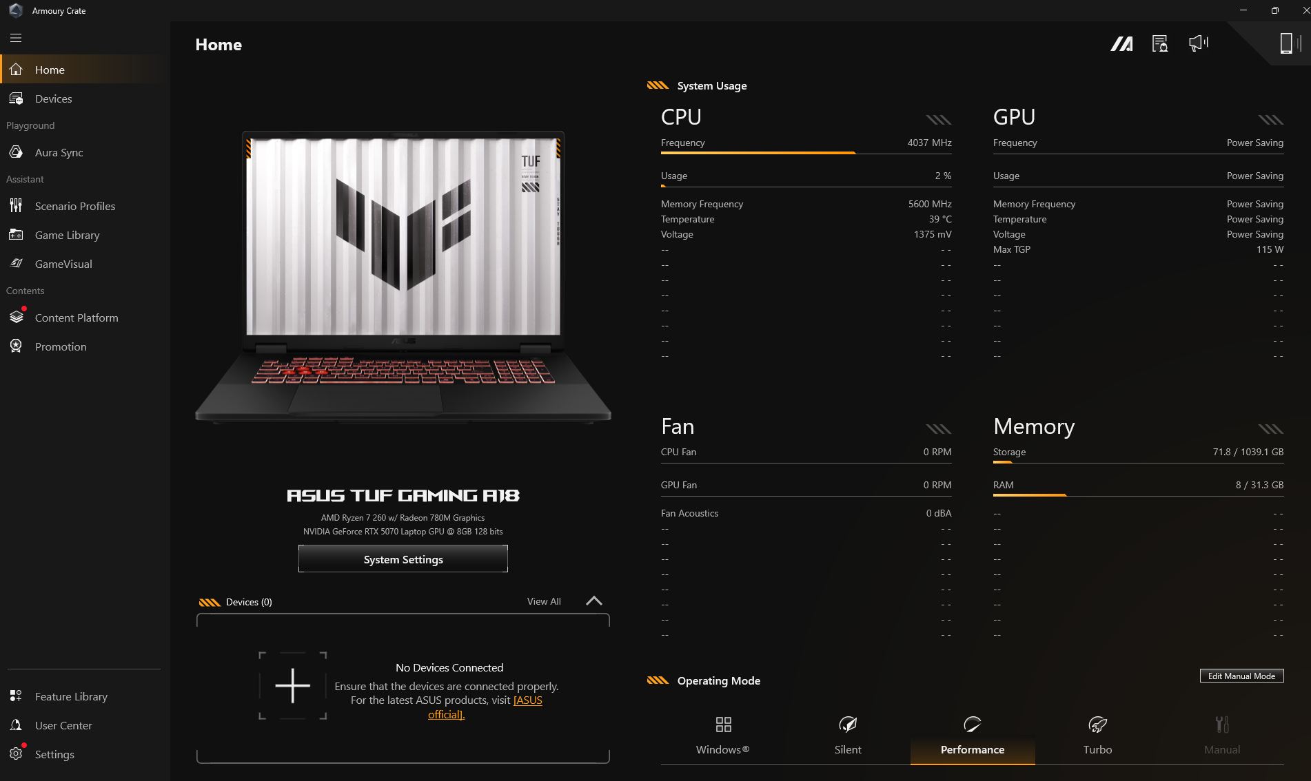Pildeyken sistem otomatik olarak 60 Hz yenileme hızıyla Sessiz moda geçer. Manuel olarak Performans moduna geri dönüldüğünde, prize takılı durumdaki Cinebench R15 skorlarının aynısı elde ediliyor.