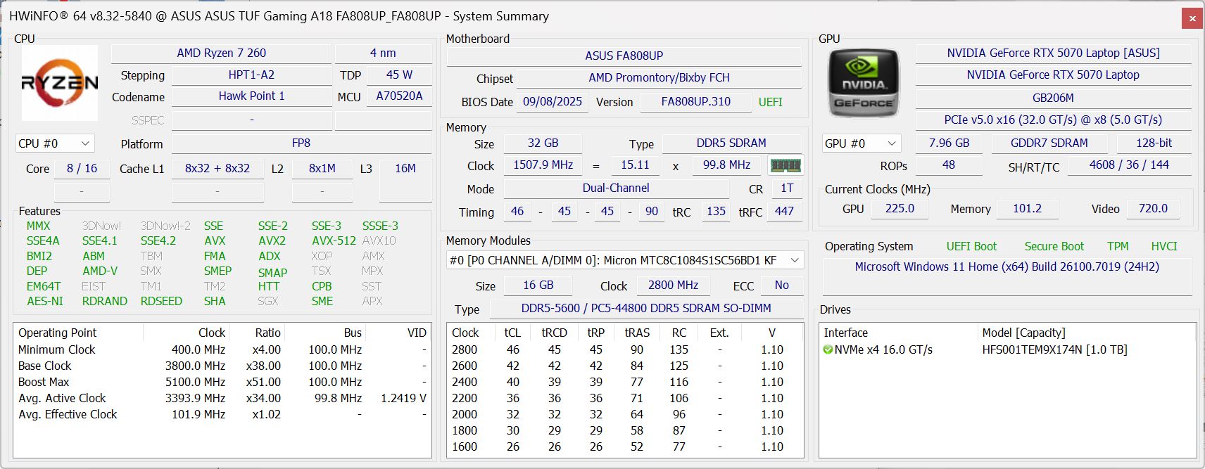 | Asus TUF Gaming A18 FA808UP-S8022W R7 260, GeForce RTX 5070 Laptop | Asus ROG Strix G18 2025 G814 R9 9955HX, GeForce RTX 5070 Laptop | MSI Crosshair 18 HX AI A2XW Ultra 9 275HX, GeForce RTX 5070 Laptop | HP Omen 17z-db100 Ryzen AI 7 350, GeForce RTX 5070 Laptop | Lenovo LOQ 17IRX10 i7-14700HX, GeForce RTX 5070 Laptop | MSI Katana 17 HX B14WGK i7-14650HX, GeForce RTX 5070 Laptop | |