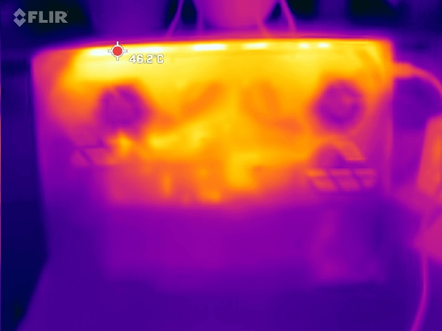 Yük altında, özellikle alt tarafta ve merkezi menteşe alanının yakınında 40°C civarında sıcak noktalar ölçtük.