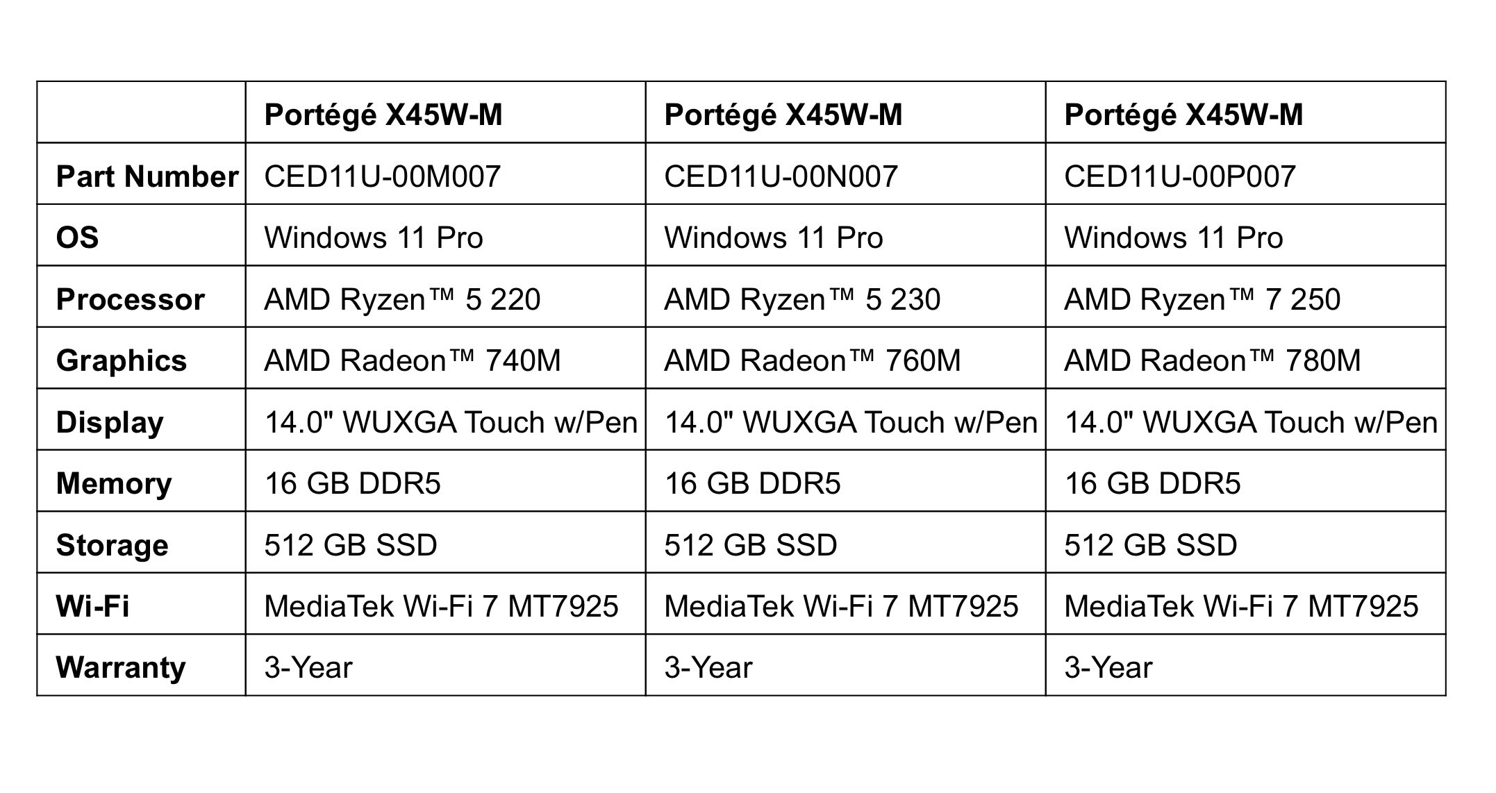 Protege X45W dizüstü bilgisayar, en fazla AMD Ryzen 7 250 APU, 8 çekirdek ve 16 iş parçacığına sahiptir. APU, yaşlanan eski Hawk Point ailesinin bir üyesidir. Şaşırtıcı olmayan bir şekilde, Zen 4 çekirdekleri yaşlarını göstermeye başladı, ancak çok çekirdekli performansta yeterince yetenekli olmalı. Ryzen 5 220 ve Ryzen 5 230 ile daha düşük uçlu varyantlar da mevcut olacak.