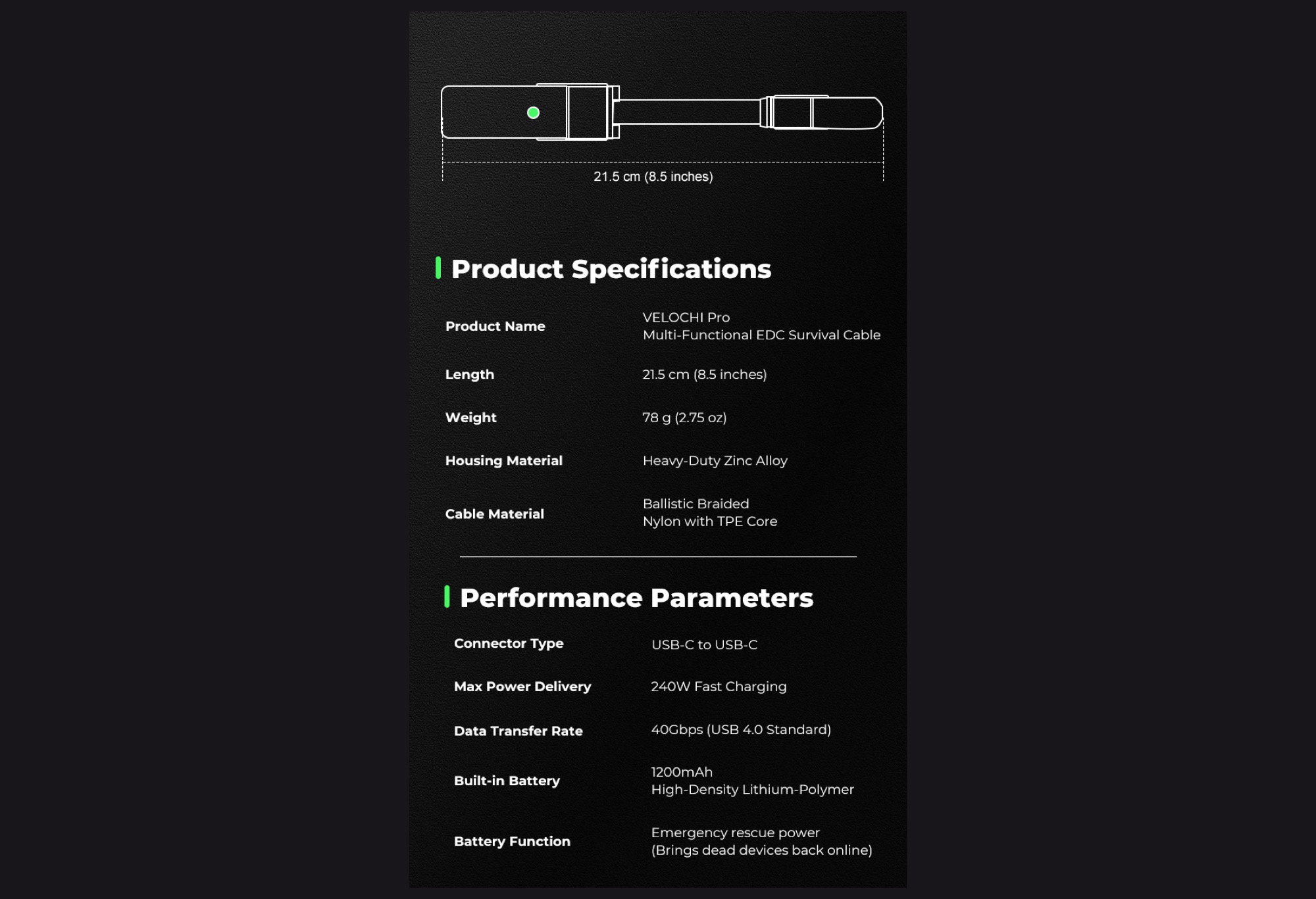 Velochi Pro, teknoloji meraklıları için bir günlük taşıma (EDC) aracı olarak pazarlanmaktadır. Birçok EDC aleti bıçak, tornavida veya paket açacağı gibi aletleri bir araya getirirken, Velochi Pro'nun kalbi 40 Gbit/s'ye kadar veri hızlarına ulaşan ve cihazları 240 watt'a kadar şarj edebilen bir USB-C - USB-C kablosudur. Velochi Pro böylece yüksek kaliteli USB-4 kablolarıyla(Amazon'da 19,99 $) rekabet ediyor.