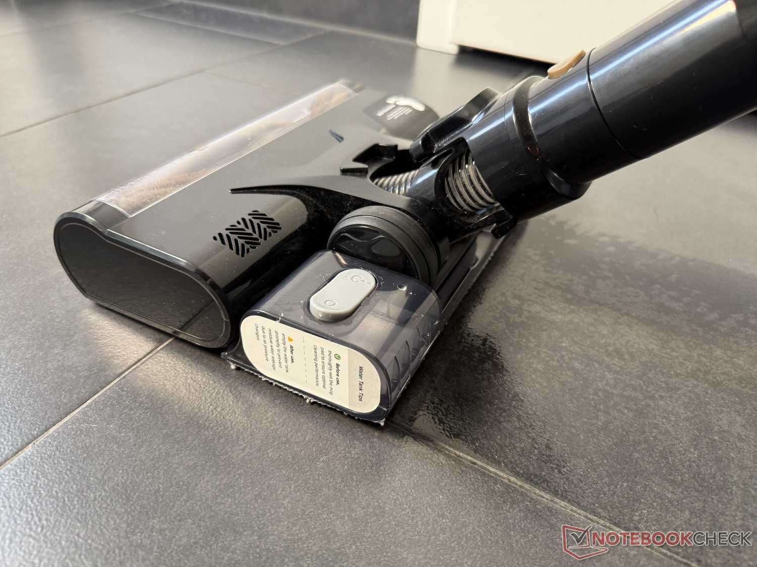 P20 OnePass'ın büyük zemin başlığı daha sonra paspaslama aparatına yerleştirilir. Ek parça, zemin silindirinin arkasına oturarak tek geçişte vakumlama ve paspaslamaya olanak tanır, ancak aynı zamanda silindirleri de engeller. Ayrıca, su haznesi süpürgenin üzerindeki yerine kilitlenmediği için ünitenin kaldırılmaması gerekir.
