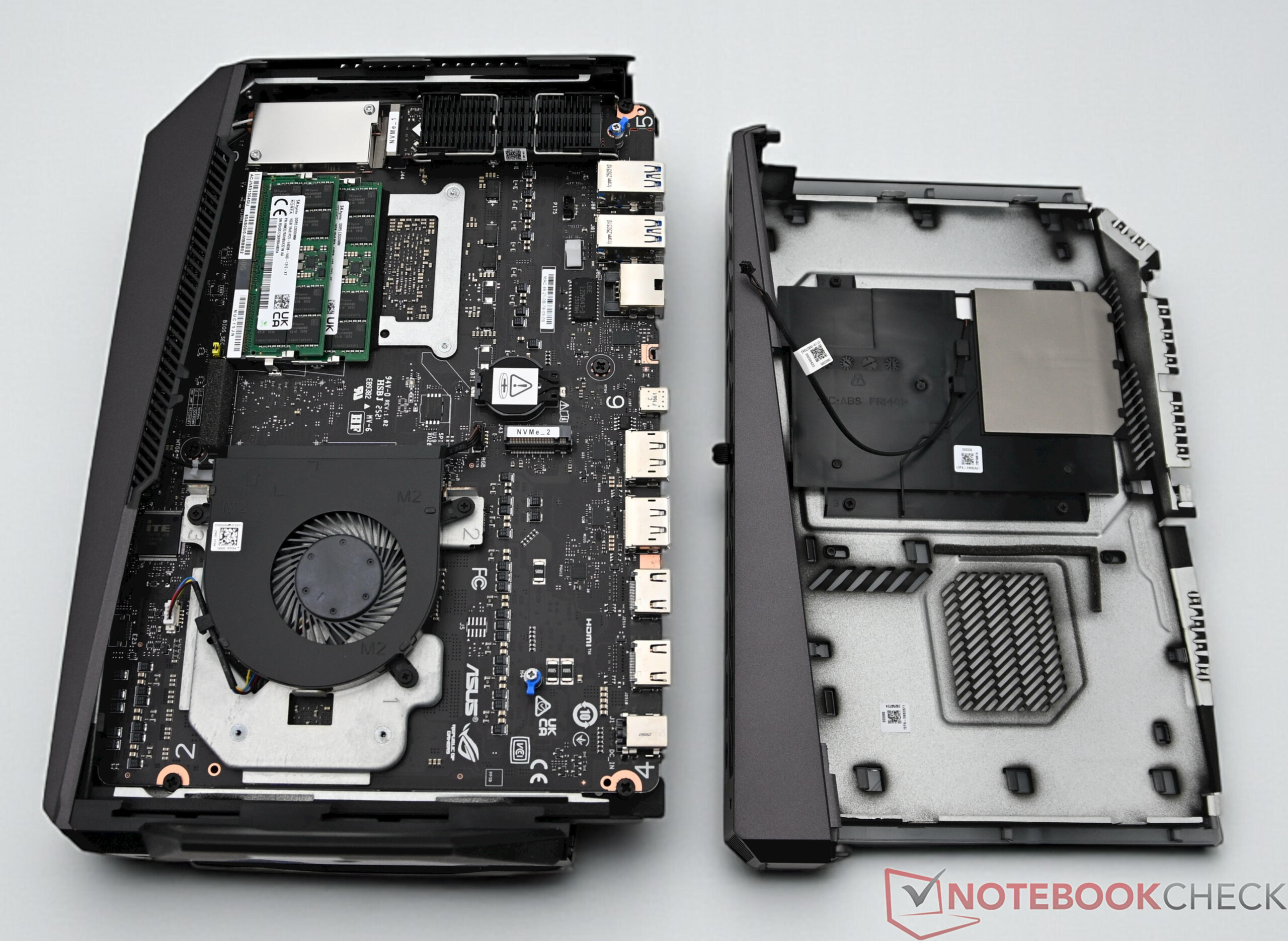 Asus ROG NUC 15 üzerinde bakım çalışmaları sorunsuz bir şekilde mümkündür. Asus, RAM ve SSD'ye erişimin kolay olması için karmaşık vida bağlantılarından vazgeçiyor. Yan paneli çıkardıktan sonra, iki adede kadar M.2 SSD için yer vardır. Gerekirse WLAN modülü de değiştirilebilir.
