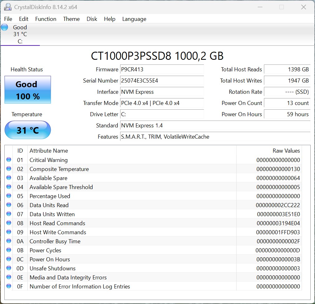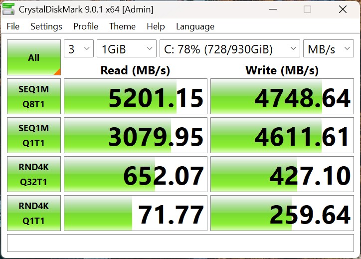 Peladn HO5'te 1 TB depolama kapasitesine sahip Crucial P3 Plus kullanılmıştır. Testte SSD, yüksek aktarım hızlarına ulaşıyor ve kısa yükleme süreleri sağlıyor, ancak performans açısından tipik PCIe 4.0 modelleriyle aynı seviyede.