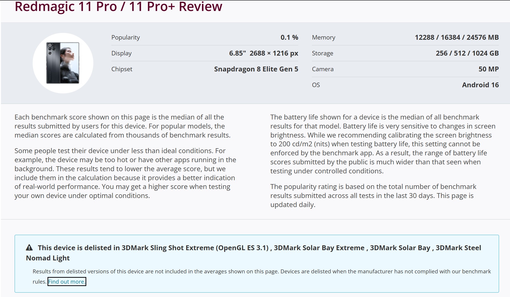 3DMark artık RedMagic 11 Pro serisinin benchmark skorlarını performans sıralamasına dahil etmiyor. Bu listeden çıkarma, kıyaslama firmasının oyun telefonu serisinin kurallarına uymadığını ve yüksek puanlar elde etmek için "hile" yaptığını tespit etmesinin ardından yürürlüğe girdi.