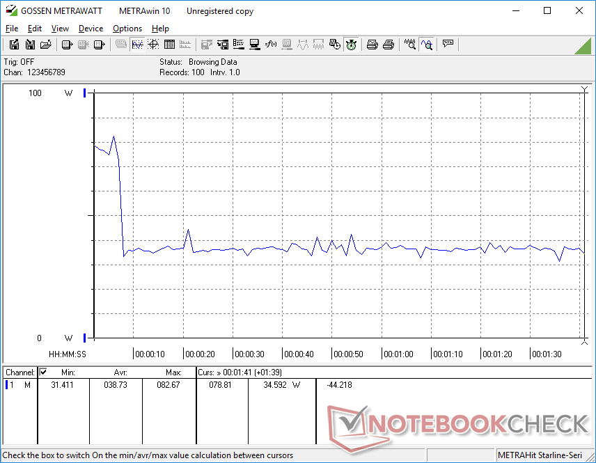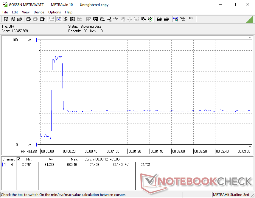 CPU yüzde 100 kullanımdayken küçük (~12,5 x 4,8 x 3 cm) 90 W AC adaptörden maksimum 87 W çekiş kaydedebiliyoruz. Bu talep, aşağıdaki güç tüketimi grafiklerimizde gösterildiği gibi kısma devreye girmeden önce sadece geçicidir.