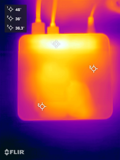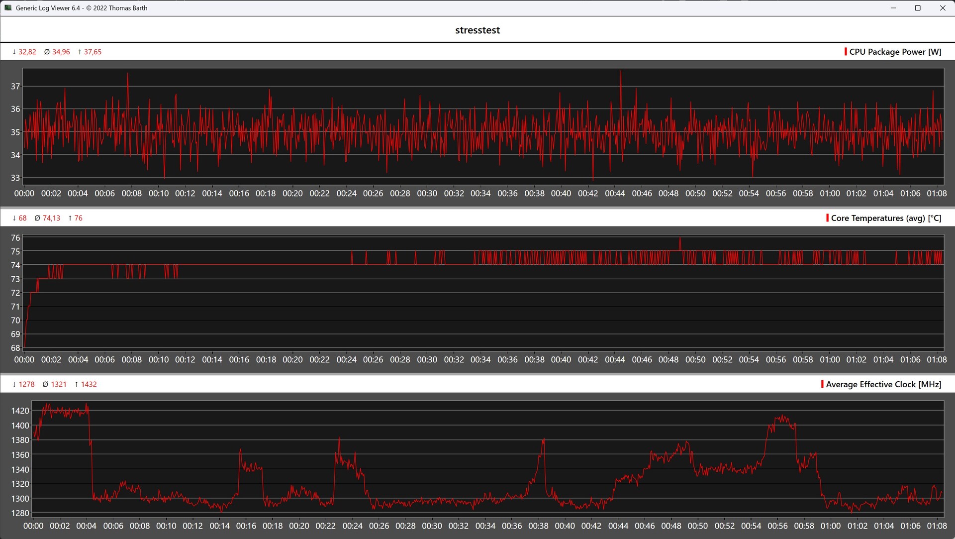 Yük altında, GMKtec NucBox M3 Ultra'nın kasası belirgin bir şekilde ısınır ve alt tarafta neredeyse 50 C'lik bir tepe değerine ulaşır. Stres testinde, Intel Core i7-12700H başlangıçta yaklaşık 76 C'ye yükselir ve daha sonra yaklaşık 74 C'de stabilize olur. SoC'nin güç tüketimi 33 ila 37 watt arasında hafifçe dalgalanır, ancak ortalama 35 watt'a ulaşılır.