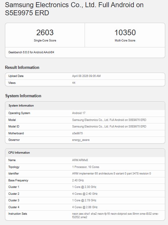 Kıyaslama platformunda görüldüğü gibi, listeleme, Exynos referans tasarım makinesini ima eden "S5E9975 ERD" olarak kaleme alınmış bir cihaza sahip. Karşılaştırmalı olarak, mevcut nesil Exynos 2600 "S5E9965" model numarasını taşıyor. Test edilen cihazda Xclipse 970 GPU ve 12 GB RAM bulunuyor; bu da üst düzey bir cihaz için oldukça uygun.