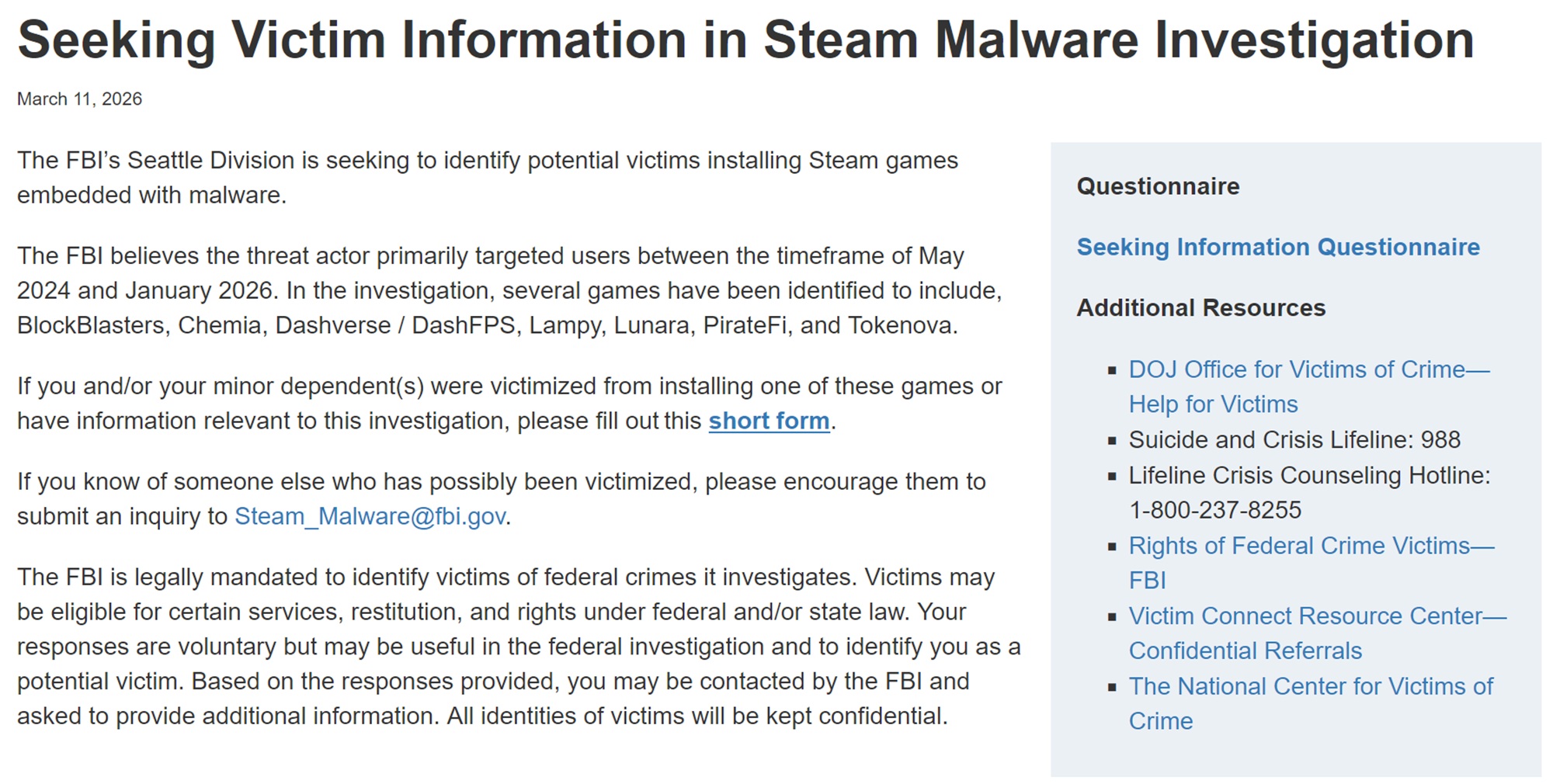 Bir dizi ziyaretten sonra kötü amaçlı yazılım bulaşmış Steam oyunları son birkaç yıl içinde ortaya çıktı FBI dikkat çekti. web sitesinde'de, etkilenen bir dizi oyun listeleniyor ve mağdurlardan daha fazla bilgi içeren bir form göndermeleri isteniyor. Valf ayrıca mesajın yasal olduğunu doğruladı ve oyuncuların soruşturmaya yardımcı olmalarını önerdi.