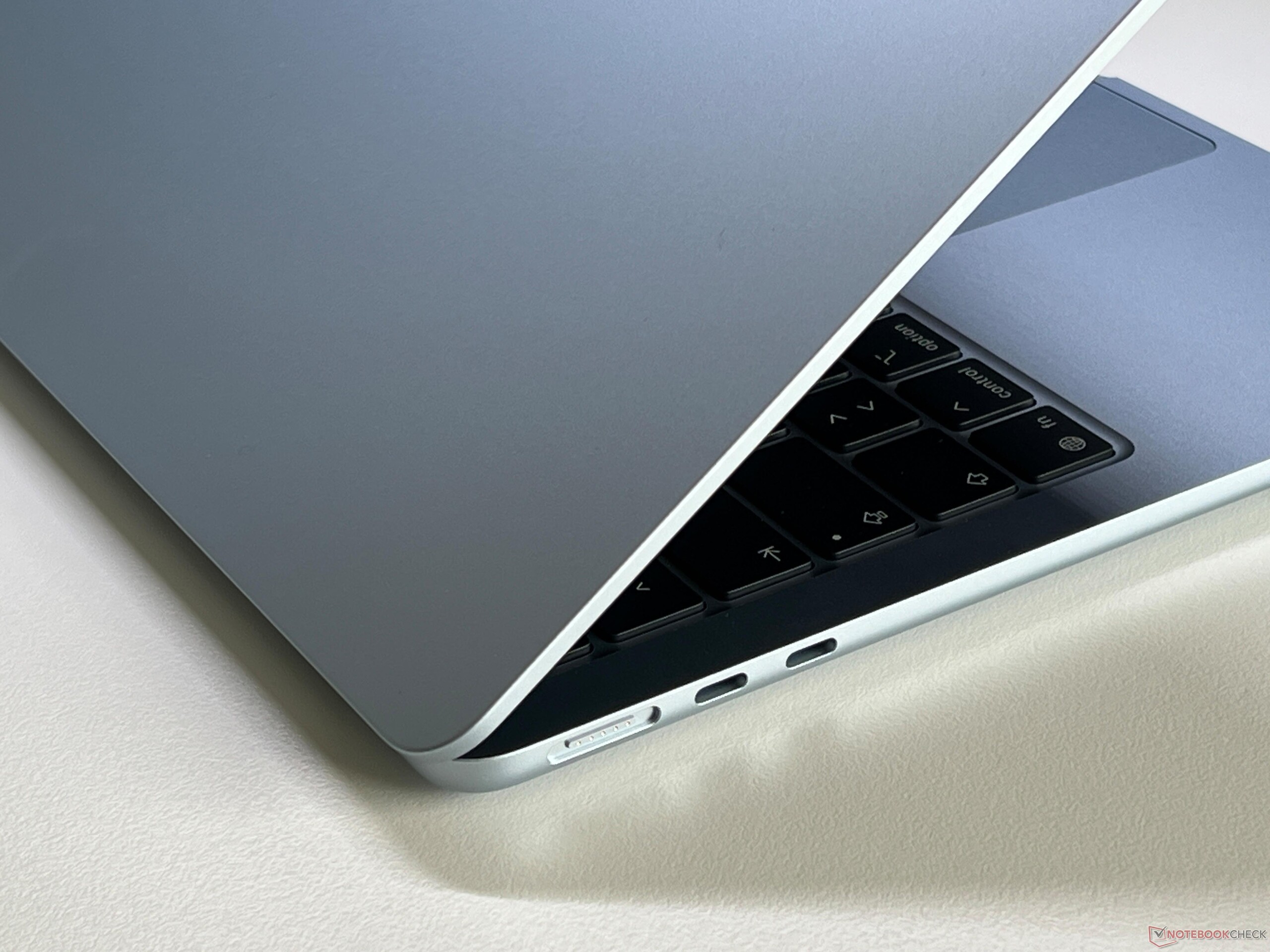 Giriş aygıtları da dahil olmak üzere şasi tasarımı önceki model air 1,xx kg ile bazı rakiplerinden biraz daha ağır olsa da hala çok ince bir alüminyum yekpare gövdeye sahip. Bağlanabilirlik MagSafe, 3.5 mm ses ve Thunderbolt 4 ile iki USB-C portu ile hala oldukça sınırlı. Apple Wi-Fi eleştirimizi düzeltti ve Air artık Apple'un kendi N1 çipi aracılığıyla Bluetooth 6.0 dahil en son Wi-Fi 7'yi destekliyor. Standartlaştırılmış Wi-Fi testimizdeki performans tam olarak tutarlı değildi ve sonuçlar daha iyi olabilirdi, ancak günlük kullanım için etkileri göz ardı edilebilir. Aşağıdaki görüntüler bir önceki modele aittir.