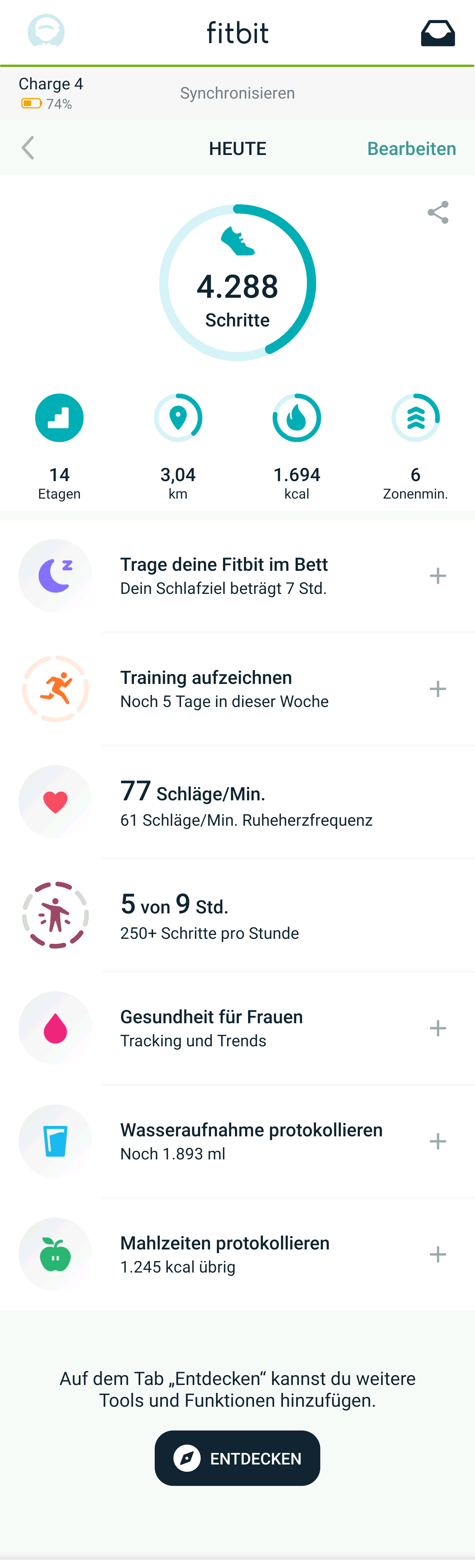 Charge 4 ile birkaç gün sonra, izleyici bilgilendirici bir fitness monitörü olduğunu kanıtladı, ancak açık hava sporları için sadece zayıf bir ekrana sahipti. Spor aktiviteleri arasında diğer izleyicilere ve özellikle Huawei'dekilere kıyasla düşük miktarda seçim göz önüne alındığında, Ücret 4 aktif sporcular için pek tavsiye edilemez. Tabii ki, tercih ettiğiniz spor seçim için mevcutsa ve çok sık parlak güneş ışığında olmayacaksanız, bireysel bir uyum bulabilirsiniz. Fitbit izleyicinin gücü, kontrol edebileceğiniz genel kondisyonun analizinde yatmaktadır. gün boyunca herhangi bir zamanda izci. Kişisel hedeflerinizden birini veya daha fazlasını gösteren bir saat yüzü seçerseniz, parametre ve günlük yaşamınızda nasıl iyileştirebileceğiniz hakkında hızlı bir fikir edinirsiniz.Şarj 4'ün gücü günlük kondisyon analizinde yatmaktadır. Ücret 4'ü fitness ve spor takibi açısından Huawei Band 4 Pro ile karşılaştırın, ikincisi spor takibinde daha geniş bir spor portföyü ve açık havada okunması daha kolay renkli bir AMOLED ekran ile kazanır. Buna ek olarak, Sağlık uygulaması egzersiz büyük grafiksel değerlendirmeler sunuyor. Öte yandan Fitbit, genel uygunluğu daha iyi değerlendirir: Etkinlik bölgesi dakikaları, tüm gün boyunca egzersizlerin yanı sıra düzenli hareketleri de dikkate alarak fiziksel eforun daha farklı bir değerlendirmesini sunar. Ancak, bu kesinlikle Ücret 4 için 149 Euro (~ 169 $) önerilen perakende fiyatları arasındaki Band 4 Pro için 79 Euro (~ 89 $) ile karşılaştırıldığında fiyat farkını haklı çıkarmaz.