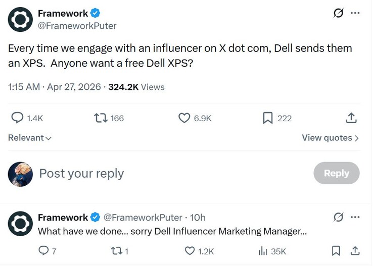 Doğal olarak, köklü dizüstü bilgisayar OEM'leri artık Framework'ü ciddiye alıyor gibi görünüyor. Framework, "X nokta com'da bir influencer ile her etkileşim kurduğumuzda, Dell onlara bir XPS gönderiyor" iddiasında bulunuyor. Gönderi iyi bir trafik elde ettibu yazının yazıldığı sırada 320 binin üzerinde görüntülenme sayısına sahipti. Bu durum, pek çok kişinin şaka yollu olarak Dell'den bir XPS alma umuduyla Framework'ten kendileriyle etkileşime geçmesini istemesine yol açtı.