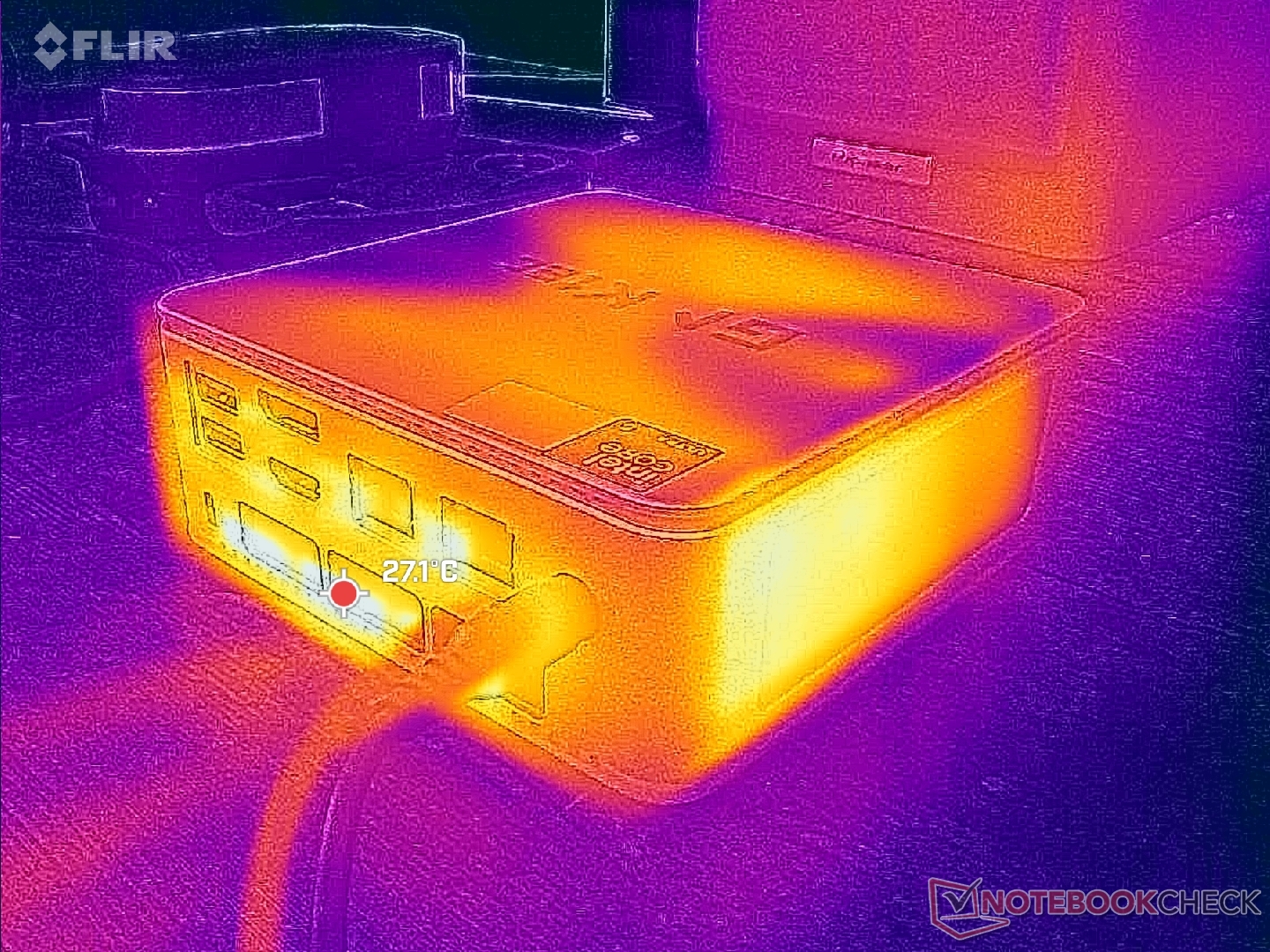 Küçük-orta boy (~14,5 x 6,4 x 3 cm) 120 W varil AC adaptörden maksimum 73 W çekiş kaydedebildik. Büyük ek yük, bağlı monitörlerin veya aksesuarların ek güç gerektirmesi durumunda Thunderbolt 4 bağlantı noktasına atfedilebilir.