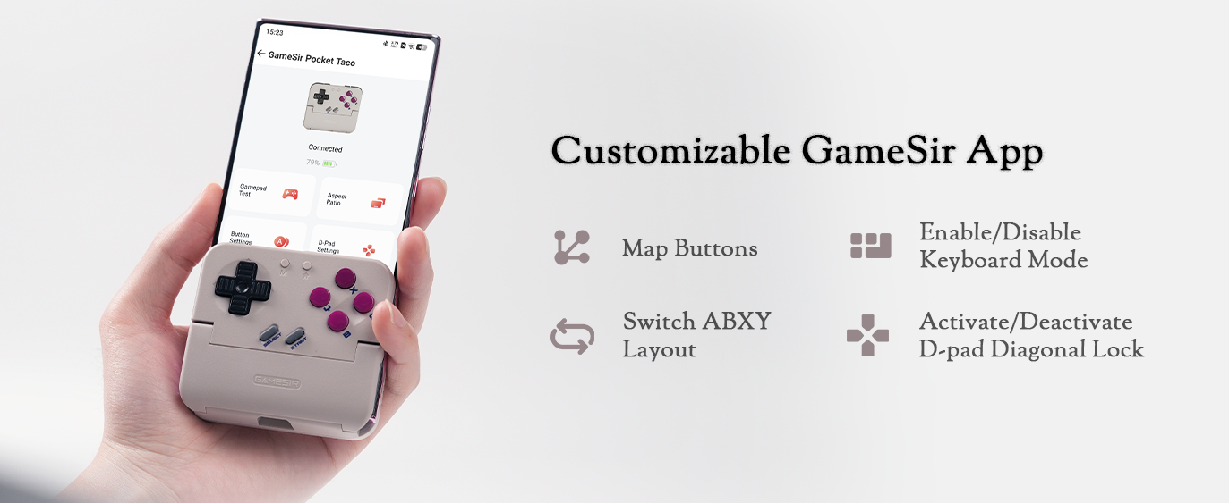 Kumanda, kullanıcılara en boy oranını/ekran ölçeklendirmesini ayarlama, düğme düzenini değiştirme (Switch veya Xbox), L1 ve L2 veya R1 ve R2 tuşlarını değiştirme, D-pad çapraz kilidini etkinleştirme ve bir klavye modunu etkinleştirme gibi bir dizi özelleştirme seçeneği sunan GameSir uygulamasıyla birlikte çalışır.