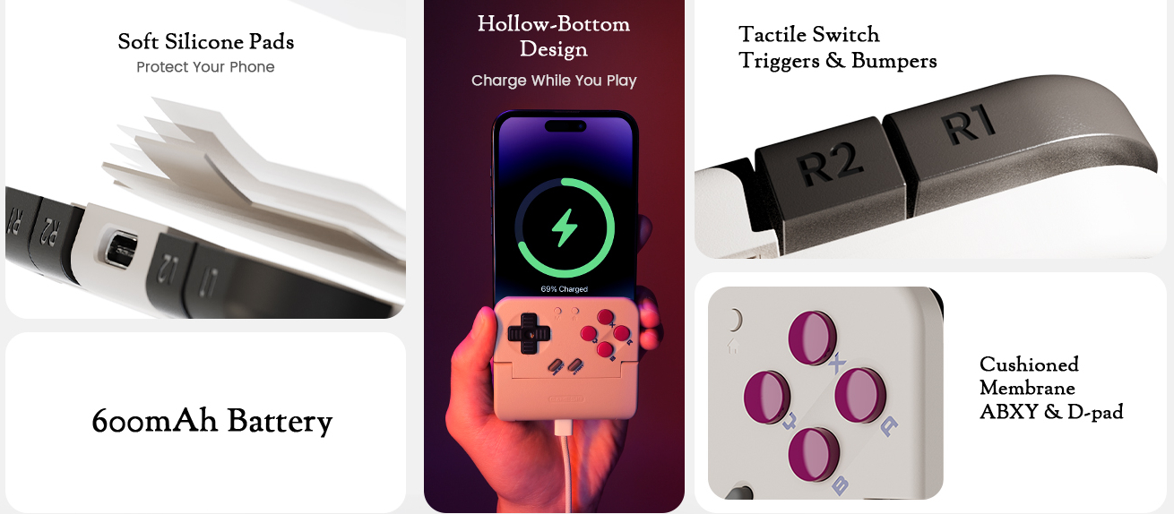 GameSir Pocket Taco, Bluetooth aracılığıyla uyumlu bir akıllı telefona bağlanır ve bir kelepçe mekanizması aracılığıyla cihaza takılır. Kumandanın iç kısmı telefonunuzu korumak için yumuşak silikon pedlerle kaplanmıştır. Kontrol cihazında membran D-pad ve ABXY düğmeleri bulunurken, tetikler ve tamponlar dokunsal anahtarlara sahiptir.