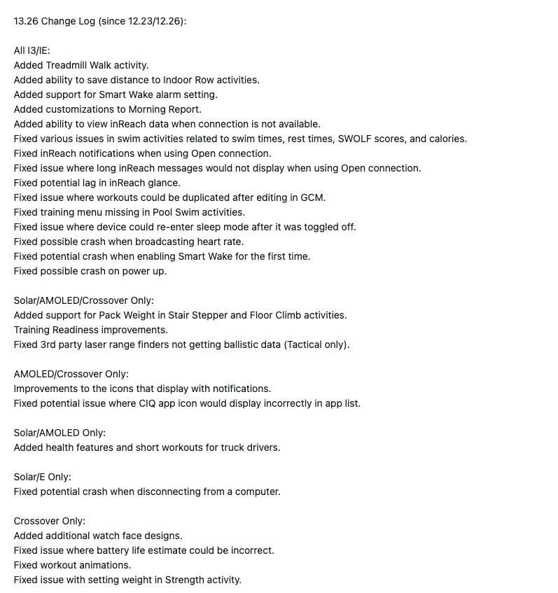 Instinct 3 ve Instinct E akıllı saatler için 13.26 sürümüyle gelen yenilik, giyilebilir cihazların başlatılırken çökmesini önleyen bir hata düzeltmesi. Solar Tactical ve AMOLED Tactical(Amazon'da 599,99 $) modellerinin kullanıcıları için şirket, 3. parti lazer mesafe bulucuların balistik verileri beklendiği gibi almamasına neden olan bir sorunu çözdü. Ayrıca, tüm Solar ve AMOLED saatler yeni sağlık özellikleri ve kamyon şoförleri için tasarlanmış kısa egzersizler kazanıyor. Ne yazık ki, değişiklik günlüğünde (aşağıda) bu araçlar hakkında daha fazla bilgi verilmiyor.
