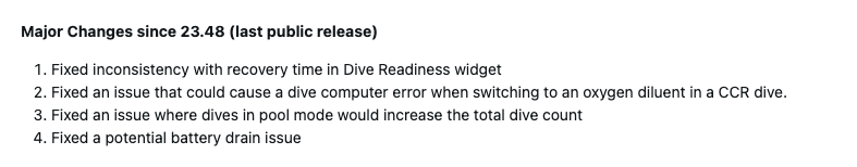 Garmin ayrıca Descent G2'nin Dalışa Hazırlık widget'ında iyileşme süresinin tutarsız olabildiği bir sorunu da ele aldı. Havuz modunda kaydedilen dalışlarla bağlantılı sorunlar, toplam dalış sayısının beklenmedik şekilde artması ve kullanıcı bir CCR dalışı için oksijen seyrelticiye geçtiğinde meydana gelen bir dalış bilgisayarı hatası için düzeltmeler var.