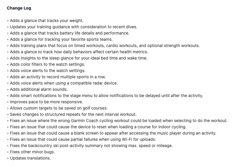 Forerunner 570 ve Forerunner 970 kullanıcıları artık golf sahalarındaki özel hedefleri kaydedebilir ve bir sonraki aralıklı antrenmanlarına hazır yapılandırılmış tekrarlar için değişiklikleri kaydedebilirler. Garmin, yanlış Garmin Coach bisiklet antrenmanının yüklenmesine neden olan bir sorunu çözdü. Ayrıca, akıllı saatin çeviri işlevi için güncellemeler var.