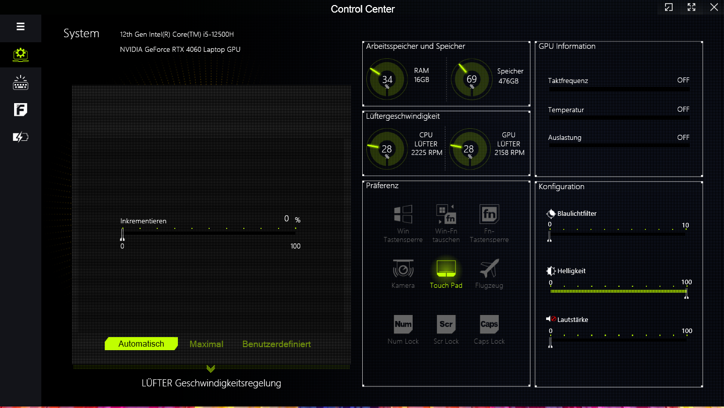 Dizüstü bilgisayar bazı alanlarda yük altında fark edilir derecede ısınıyor ve ayrıca oldukça fazla gürültü üretiyor. Sağlanan performans profillerini kullanarak gürültü sorununu azaltabilirsiniz, ancak performans bir darbe alacaktır. Ne yazık ki, azaltılmış güç adaptörü (180 watt yerine 150 watt) her türlü yük durumunun (örneğin stres testleri) üstesinden gelebilecek kadar yetenekli değil.
