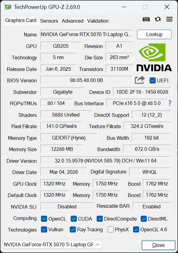 | Gigabyte Gaming A16 Pro GA6DH (Core 7 240H, RTX 5070 Ti) Core 7 240H, GeForce RTX 5070 Ti Laptop, Samsung PM9C1b MZVL81T0HFLB-00BTW, IPS, 2560x1600, 16" | Gigabyte Gaming A16 GA6H i7-13620H, GeForce RTX 5070 Laptop, Kingston OM8PGP41024Q-A0, IPS, 2560x1600, 16" | Schenker XMG APEX 16 MAX R9 9955HX, GeForce RTX 5070 Ti Laptop, Samsung 9100 Pro 2 TB, Mini-LED, 2560x1600, 16" | Acer Predator Helios Neo 16S AI PHN16S-71-94L9 Ultra 9 275HX, GeForce RTX 5070 Ti Laptop, Micron 3500 1TB MTFDKBA1T0TGD, OLED, 2560x1600, 16" | Medion Erazer Major 16 X1 MD62736 Ultra 7 255HX, GeForce RTX 5070 Ti Laptop, Phison E31 2 TB, IPS, 2560x1600, 16" | Lenovo Legion 5 Pro 16IAX10H Ultra 9 275HX, GeForce RTX 5070 Ti Laptop, Western Digital PC SN8000S SDEPNRK-1T00, OLED, 2560x1600, 16" | Ortalama NVIDIA GeForce RTX 5070 Ti Laptop | Sınıf ortalaması Gaming | |