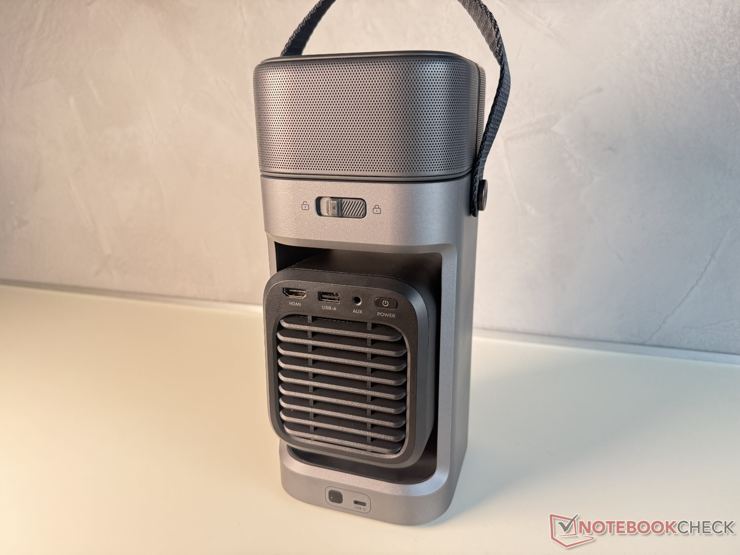 Daha pahalı modellerde olduğu gibi X1 ve X1 Pro anker Soundcore, P1'e bir batarya entegre etmekten de vazgeçti. Bu, böylesine mobil bir konsept için üzücü bir durum, ancak sonuçta daha büyük boyutlara, daha yüksek bir ağırlığa ve daha pahalı bir fiyata yol açabilirdi. Nebula P1, hoparlörler dahil 2,4 kg'dan daha hafiftir ve yaklaşık 28 x 13 x 13 cm (hoparlörler dahil) boyutlarındadır, bu da esnek taşıma sapının da yardımıyla taşınmasını kolaylaştırır.