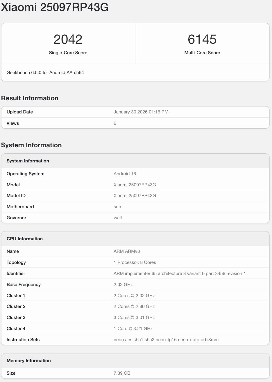 Geekbench listelemesi ayrıca küresel Xiaomi Pad 8'in şunları çalıştırdığını ortaya koyuyor Android 16. Diğer özellikler hala doğrulanmadı ancak muhtemelen Çinli muadiline benziyor.