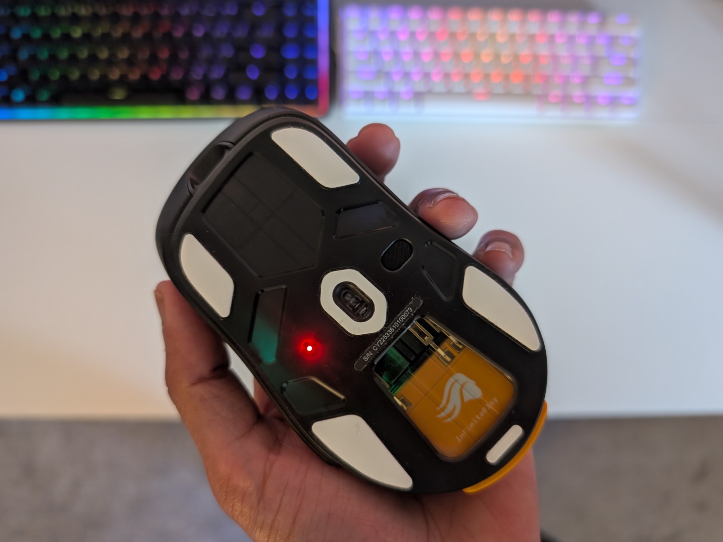 Glorious, V3 mouse'larda siyah/beyaz + turuncu renk şemasını tercih etti ve biz de inceleme için siyah varyantı aldık. Bu, RGB kapalı olsa bile değiştirilebilir pil arkadan göründüğü için farede biraz renk olduğu anlamına geliyor. İki yan düğme ve üstte, kaydırma tekerleğinin arkasında bir DPI düğmesi var. Tıklamalar ve gövde, RGB aydınlatmanın parladığı yarı saydam bir boşlukla ayrılmıştır. Değiştirilebilir pil arkadan takılıyor ve bir itme hareketiyle yerine oturuyor. Alt kısımda %100 PTFE ayakların yanı sıra güç ve mod anahtarı kombo düğmesi bulunur.