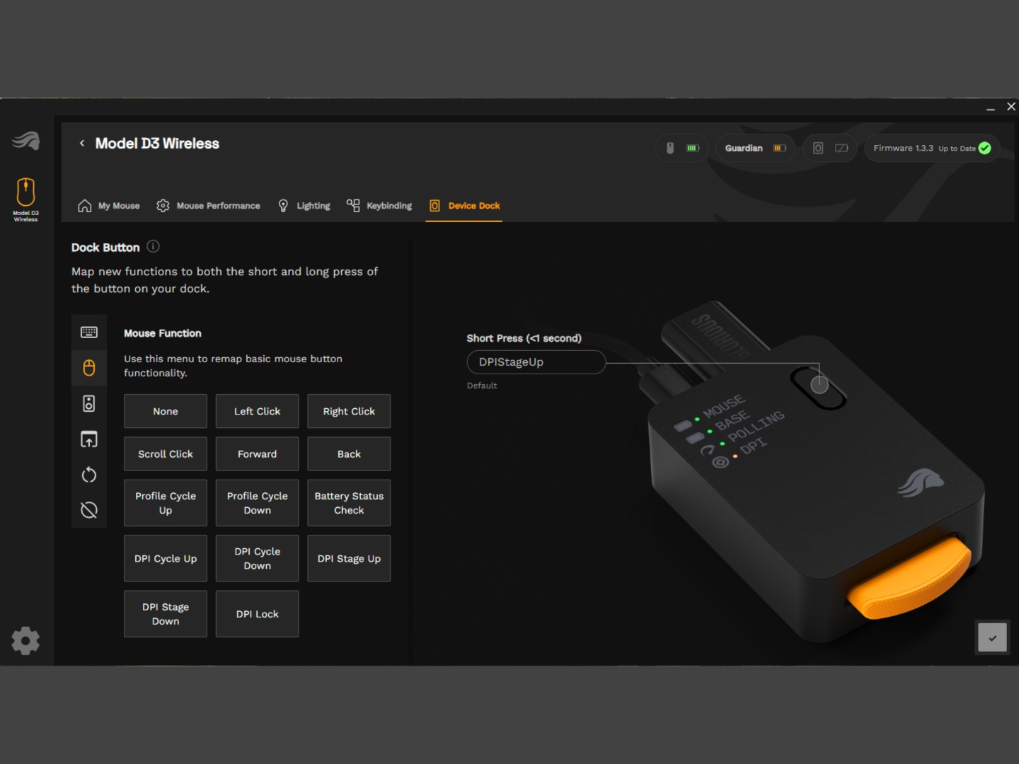 Taban, bir bağlantı ve şarj istasyonu görevi görür. Sadece 2,4 GHz dongle'ı barındırmakla kalmaz, aynı zamanda yedek pili şarj etmek için bir yuvaya sahiptir. Ayrıca farenin pil seviyelerini, yedek pili, yoklama hızını ve DPI'ı izlemek için dört LED gösterge vardır. Glorious, tabana Core yazılımı aracılığıyla özelleştirilebilen bir düğme de eklemiştir. Uygulamaları başlatmak veya makroları çalıştırmak için kullanılabilir, ki bu oldukça havalı.