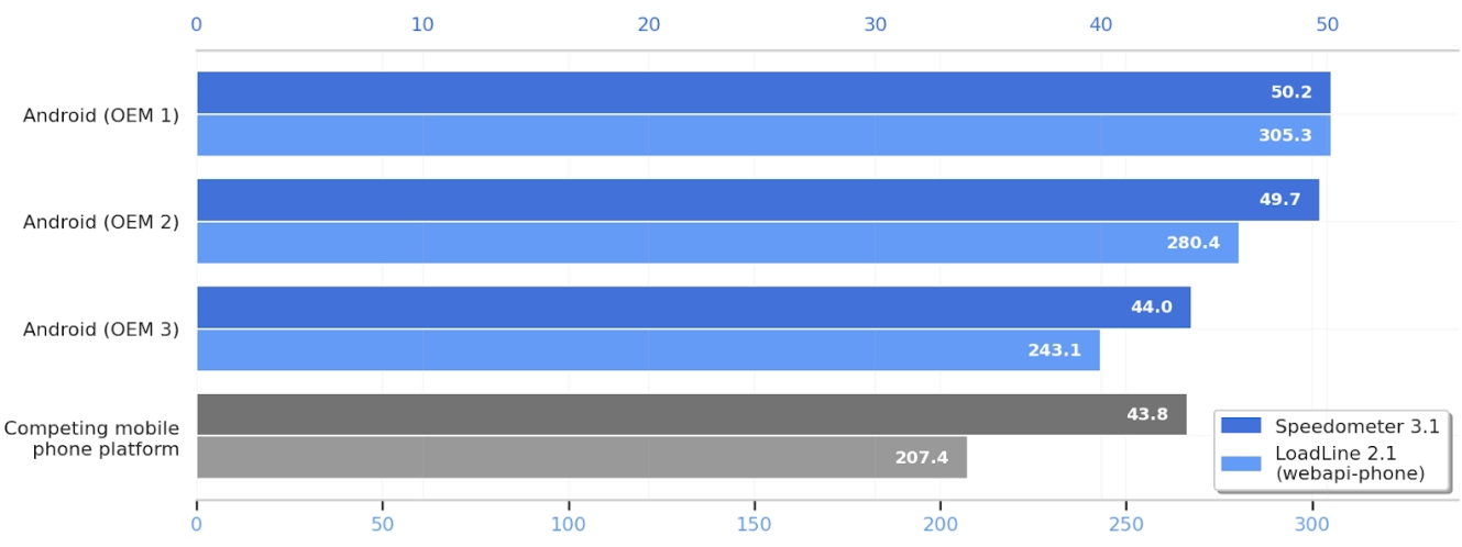 Speedometer, Apple, Google ve Mozilla'nın ortak bir projesidir ve bir tarayıcının ne kadar "hızlı" hissettirdiğini ölçmek için göz atmak ve kaydırmak için düğmelere tıklamak gibi yaygın kullanıcı görevlerini simüle eder. Google tarafından paylaşılan kıyaslama sonuçları, adı açıklanmayan Android amiral gemisi telefonların "rakip bir cep telefonu platformunun" (iOS olarak okuyun) en yeni telefonlarını geride bıraktığını gösteriyor.