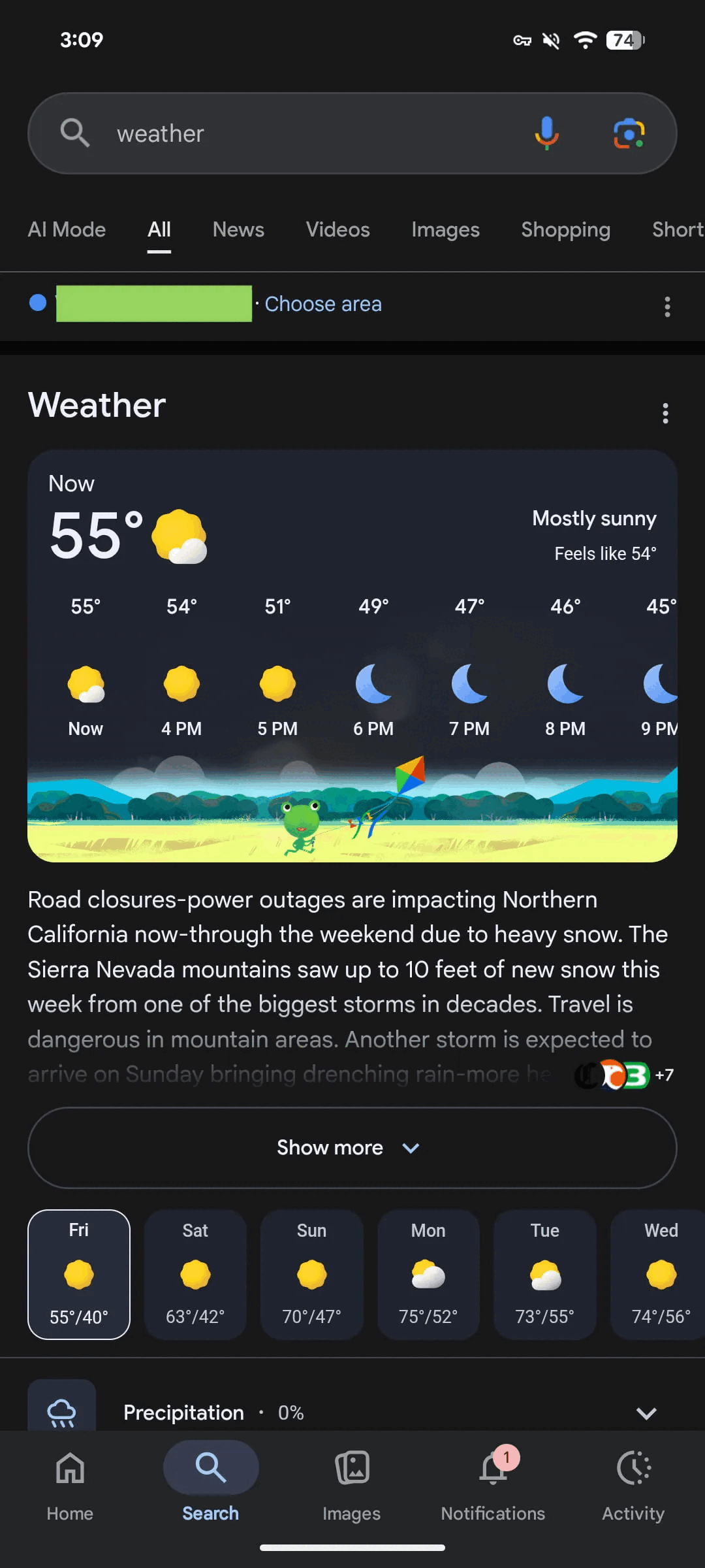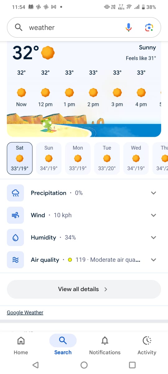 Artık ana ekrandan Hava Durumu kısayoluna dokunulduğunda kullanıcılar Google Arama hava durumu sonuçları sayfasına yönlendiriliyor ve bu sayfada tahmin verileri tanıdık bir Froggy arka plan kartıyla birlikte yapay zeka hava durumu özeti, standart 10 günlük tahmin karuseli ve hava kalitesi, nem, rüzgar ve yağış için açılır menülerle birlikte görüntüleniyor.