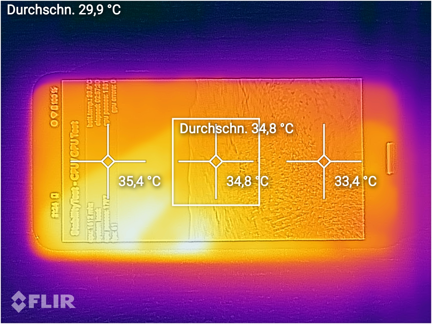 Our measurements show that the Pixel 4a reaches surface temperatures of up to 38.4 °C (~101 °F) under load. As a result, the smartphone only heats up moderately. The demanding Manhattan 3.1 and ES 2.0 GFXBench endurance tests also show that users don't have to expect a drop in system performance, even with prolonged use.