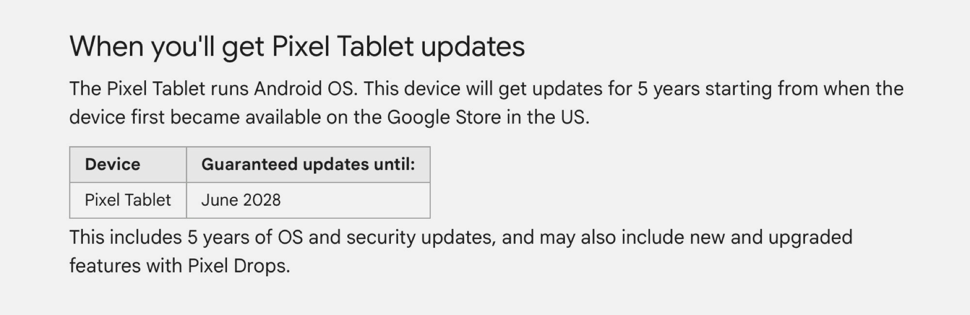 Google Pixel tablet Haziran 2023'te Android 13 ile piyasaya sürüldü. Başlangıçta Google, Pixel tabletin beş yıl boyunca güvenlik yamaları alması gerekmesine rağmen, Haziran 2026'ya kadar yalnızca üç büyük Android güncellemesi ve özellik güncellemesi sözü vermişti. Şimdi, Google destek web sitesinde onayladı pixel tabletin beş yıl boyunca işletim sistemi güncellemelerini alacağını duyurdu.