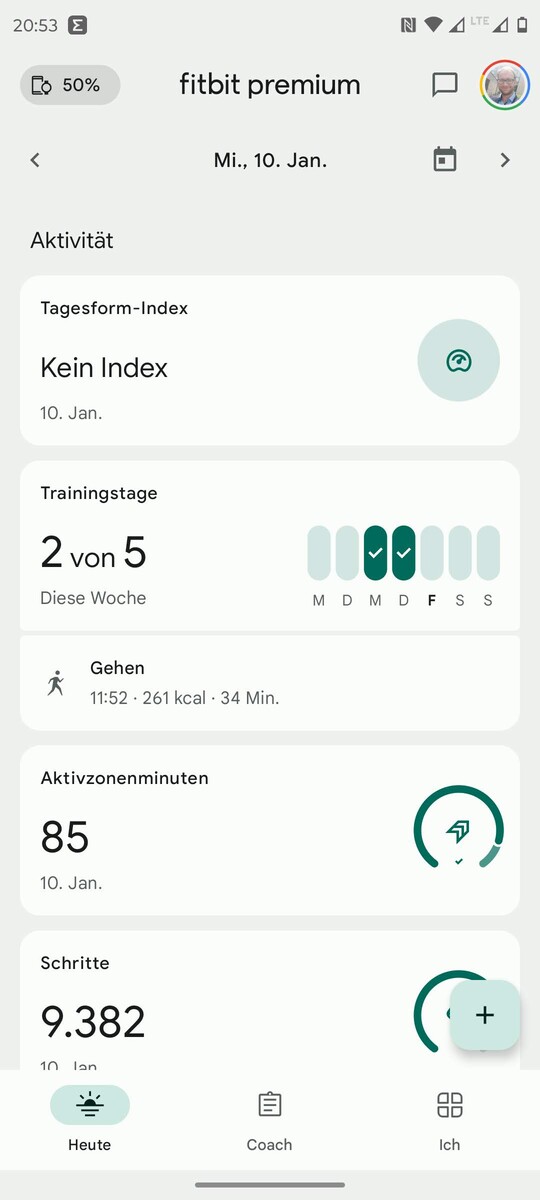 Fitbit uygulaması üç ana bölüm halinde düzenlenmiştir: Bugün, Koç ve Ben. Bugün, günlük aktivite, uyku, günlük şekil, haftalık antrenman günleri, sağlık değerleri ve stres için widget'lar gösteren bir gösterge paneli görevi görüyor. Belirli bir widget'a tıklandığında ilgili alt menüye gidilir.