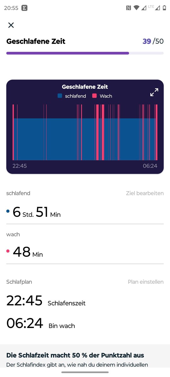 Bu değerler bir gün için olduğu kadar daha uzun süreler için de görüntülenebilir. Akıllı saat en az 14 gece boyunca takılırsa, yazılım aylık bir uyku profili oluşturur. Test sırasında uyku sürelerinin her zaman doğru kaydedilmediğini gözlemledik. Bazı durumlarda saat, kullanıcının çok geç uykuya daldığını tespit etti. Üreticinin uyku verilerini akıllı bir çalar saat için kullanmaması üzücü.