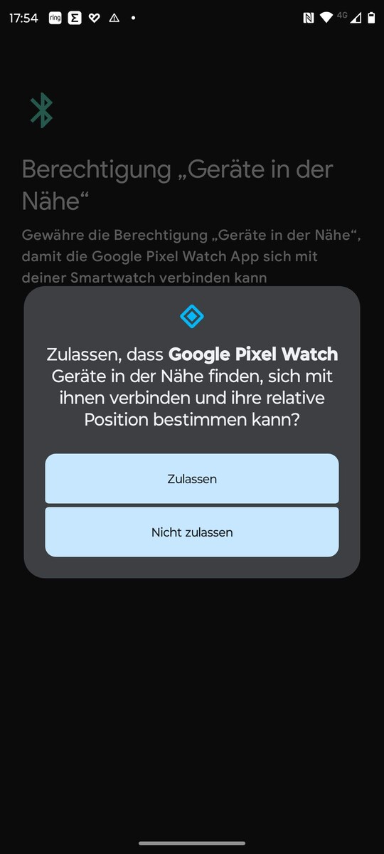 Pixel Watch 2 yalnızca Android cihazlarıyla uyumludur. Yeni akıllı saat açıldığında, yakındaki akıllı telefonlarda kurulum sürecini başlatan bir açılır pencere beliriyor. Uygulama, kullanıcıları çeşitli kurulum adımlarında yönlendiriyor ve bildirim gönderme gibi izinler talep ediyor.